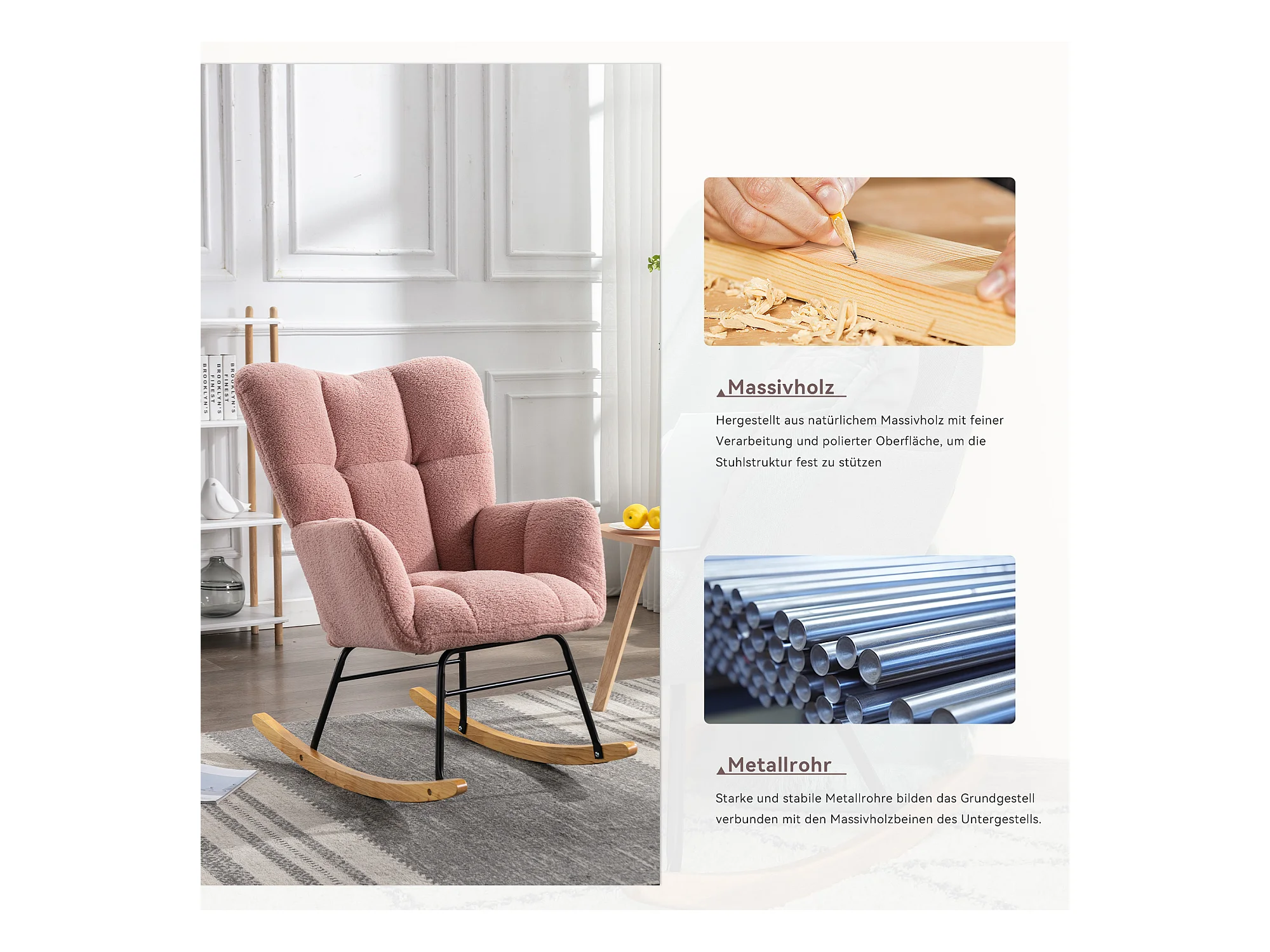 Chaise à bascule moderne Mid-Century, tissu Tissu peluche, capitonné, bois et métal, rose (80x70x95 cm)