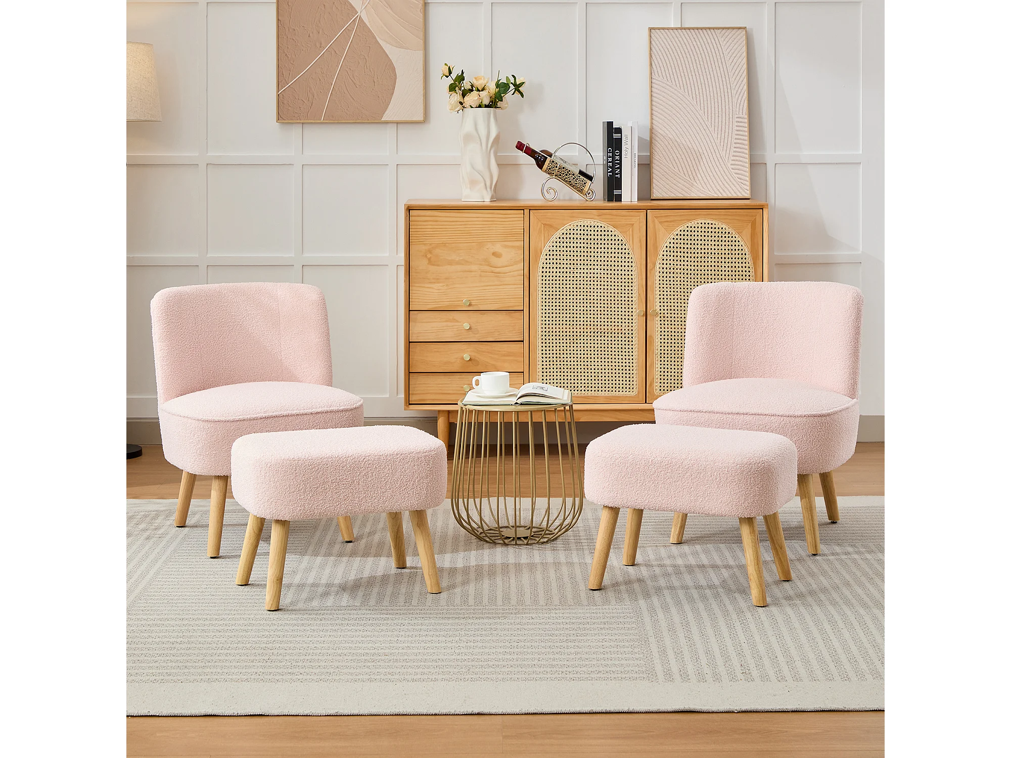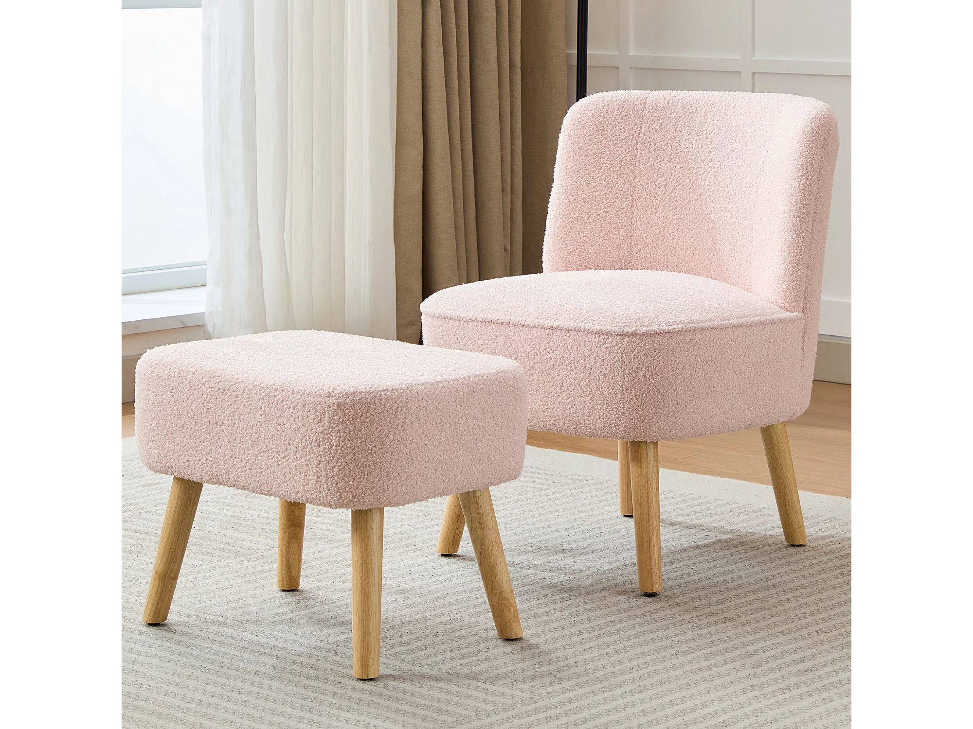 Chaise avec repose-pièd - Velours teddy et pièds en bois massif - 60 x 67 x 76 cm - Rose