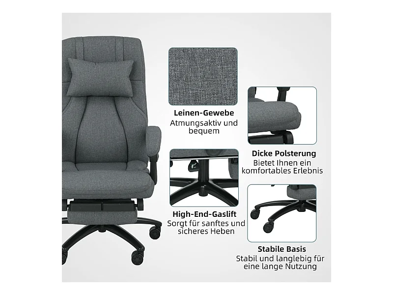 Fauteuil de bureau avec appui-tête et accoudoirs, réglable en hauteur, pivotant avec repose-pieds, lin, ergonomique, 66x70x116-124 cm