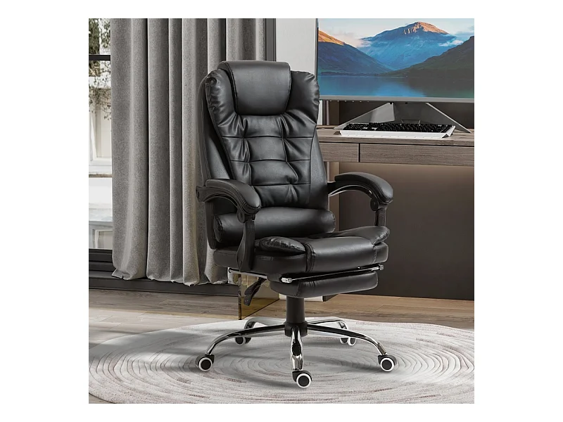 Chaise de bureau pivotante et réglable en hauteur avec repose-pieds, revêtement cuir synthétique noir, confortable pour travailler