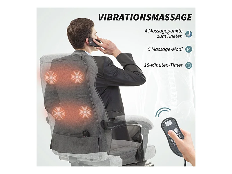 Chaise de bureau ergonomique Vinsetto avec fonction massage et chauffage, inclinable 135°, réglable en hauteur, support jusqu’à 120 kg, couleur gris