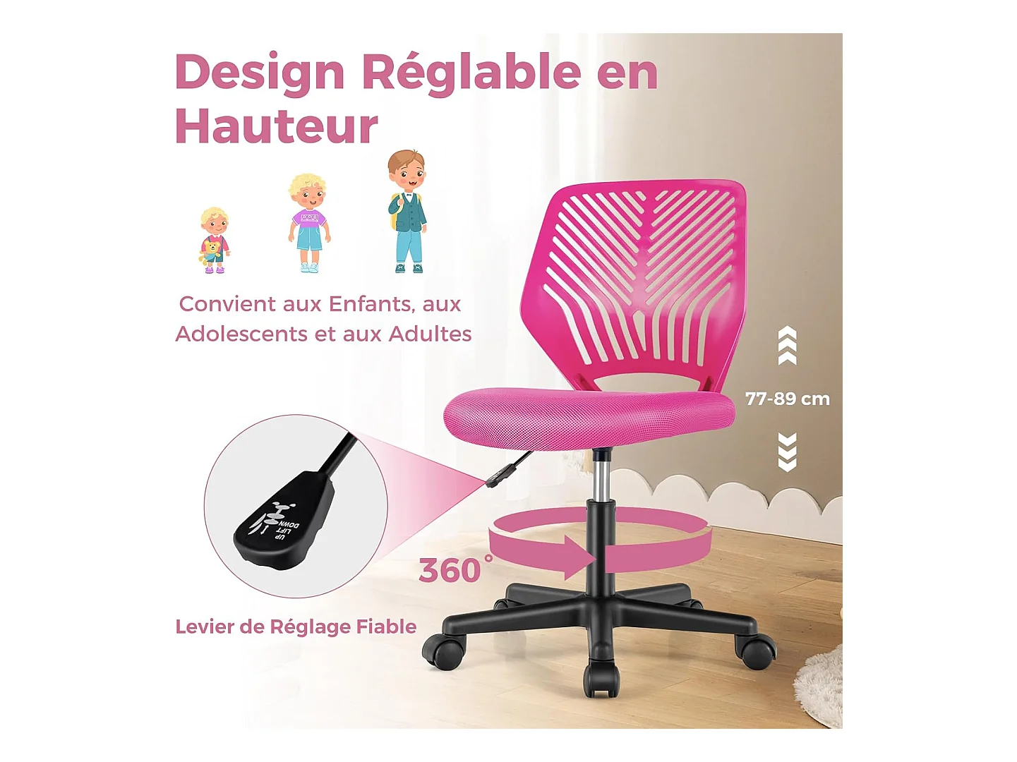 Chaise de Bureau Pivotante Enfants avec Hauteur Réglable 77-89cm, Siège à roulettes avec Dossier Ergonomique & Base à 5 Étoiles, Charge 150kg pour Enfant Adolescent Adulte (Rose)