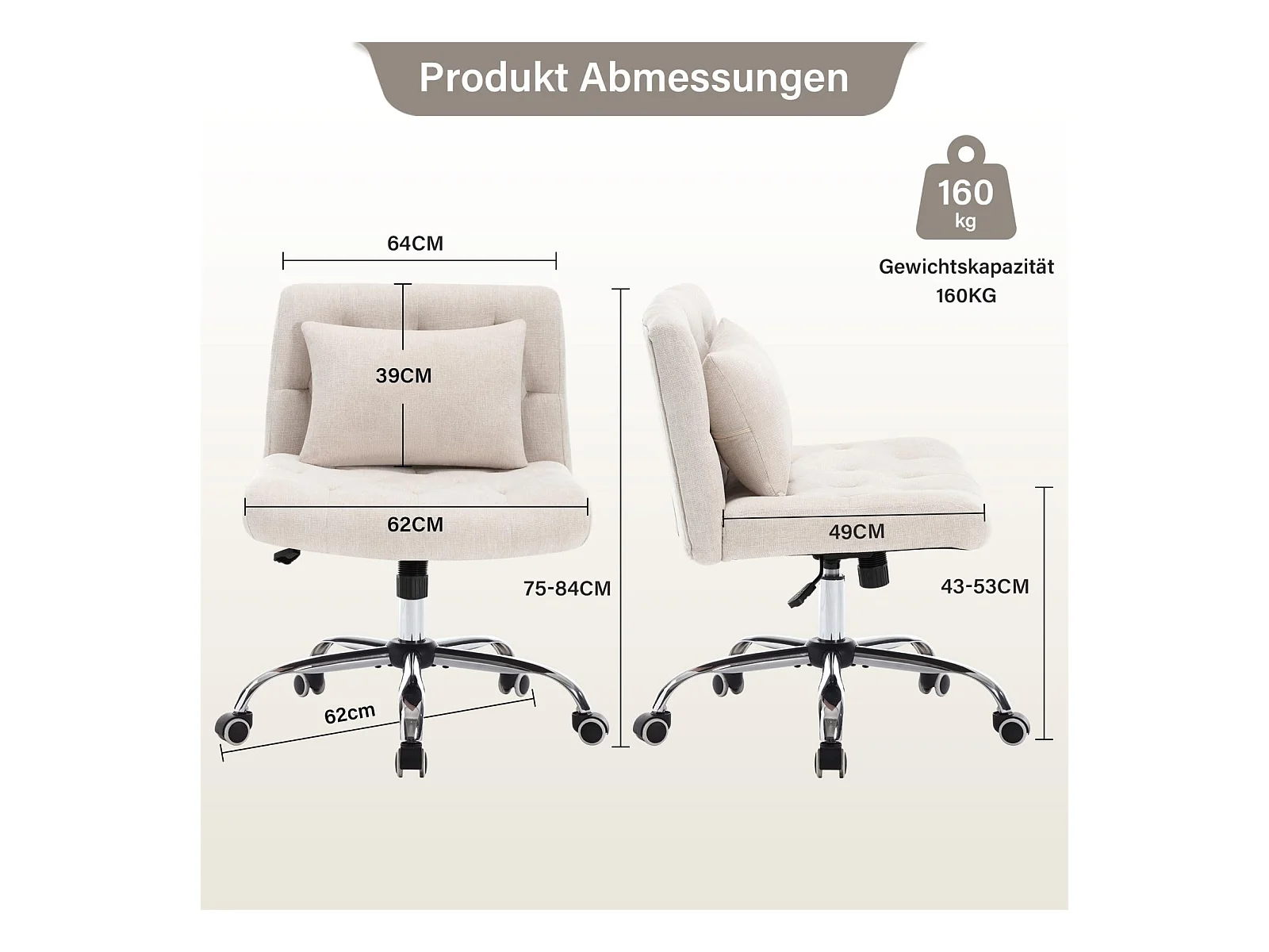 Chaise de bureau pivotante sans accoudoirs en lin avec coussin lombaire, siège avec roulettes pour chambre ou bureau, pour femmes, capacité 160 kg