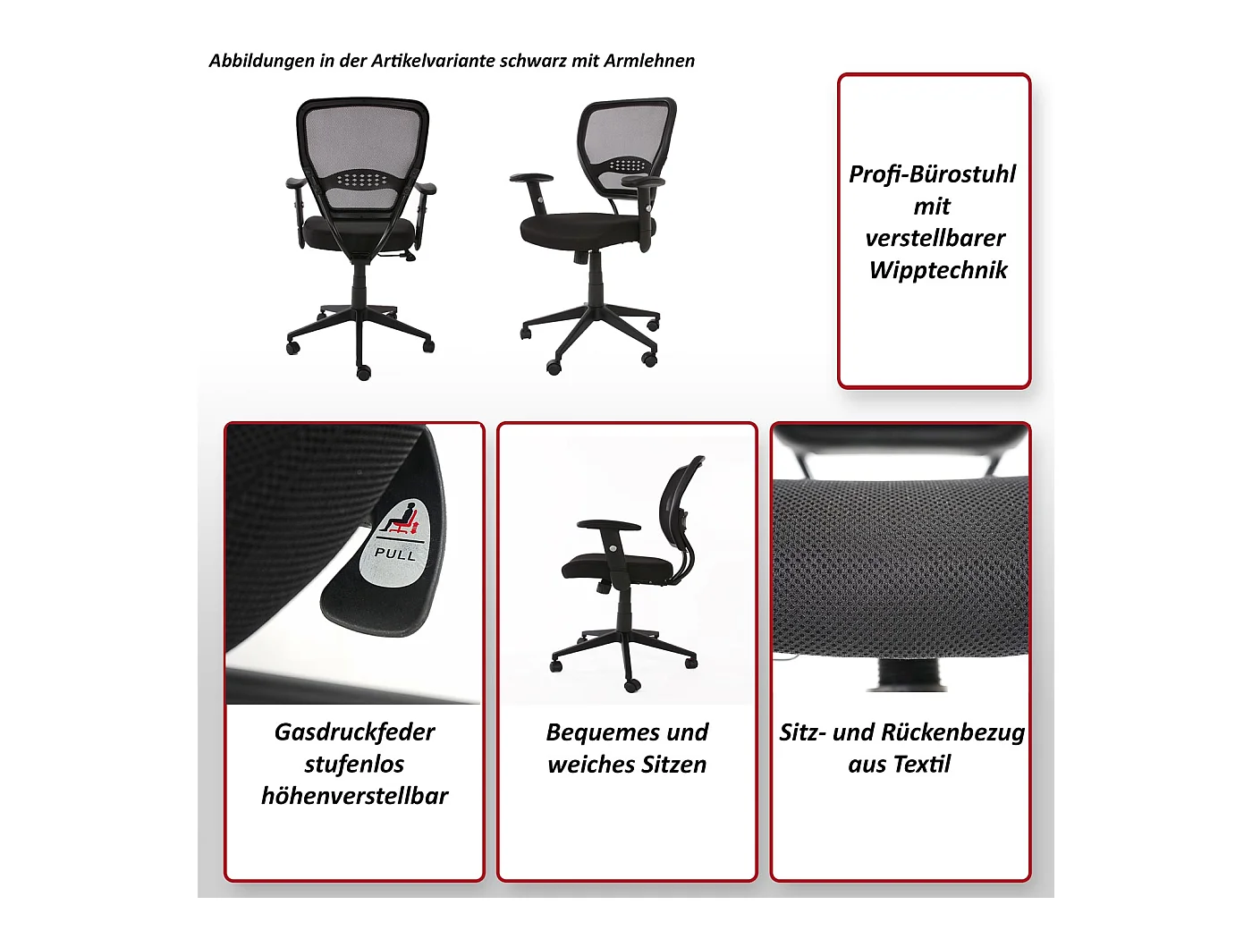 Chaise de bureau professionnelle Chicago tissu/textile, noir avec accoudoirs