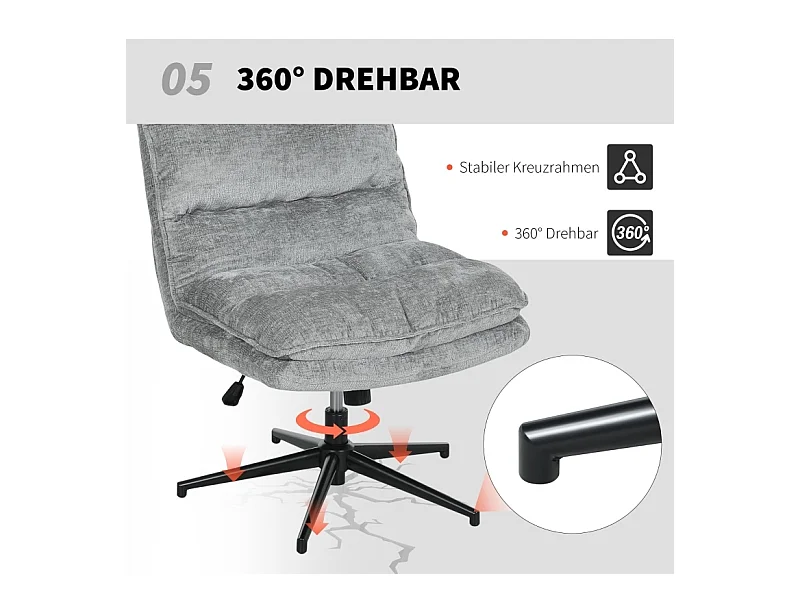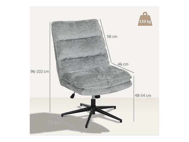 Chaise de bureau sans accoudoirs, pivotante et rembourrée, revêtement en tissu doux, réglable en hauteur, pieds en acier, couleur gris, confortable et pratique