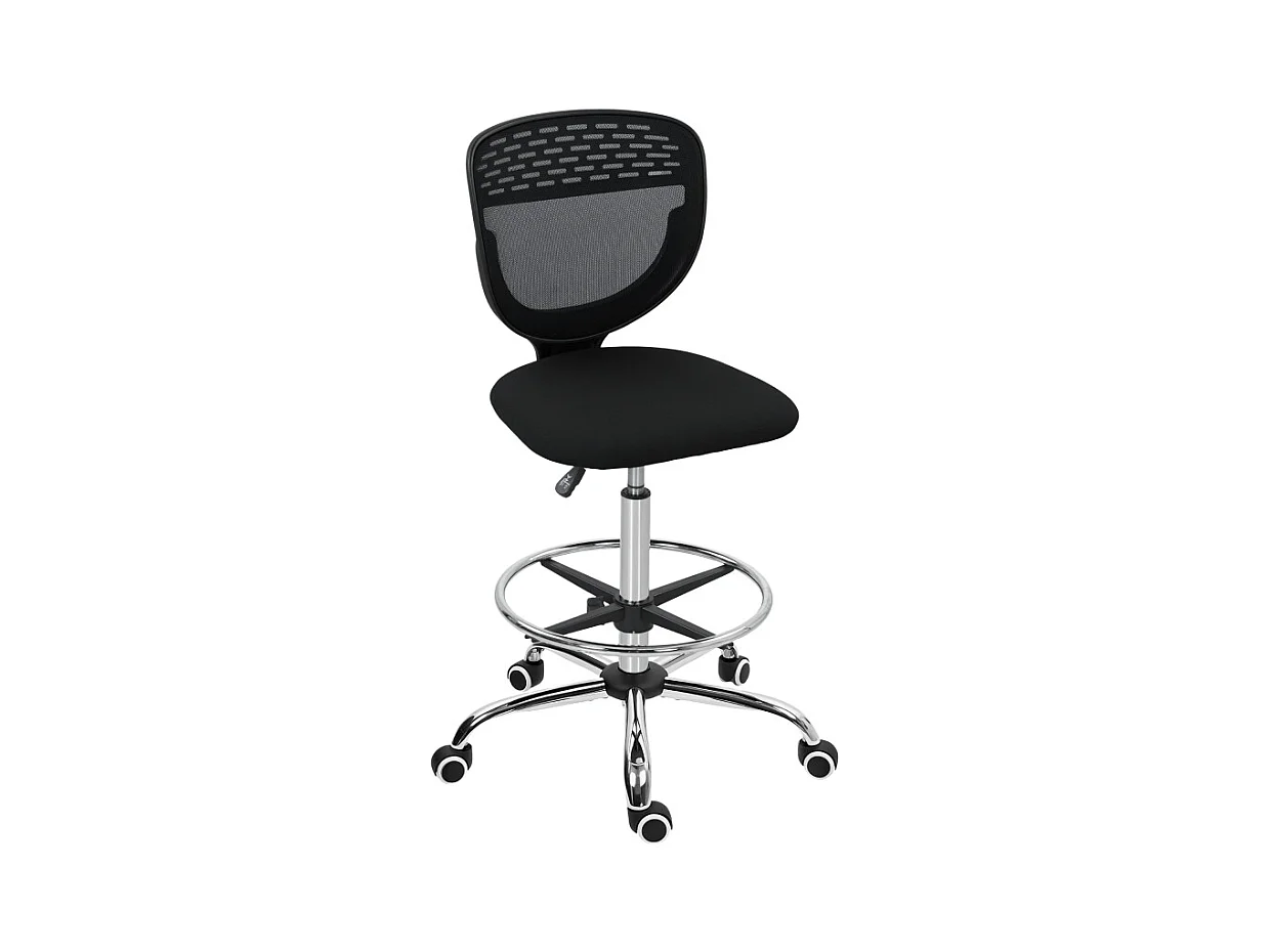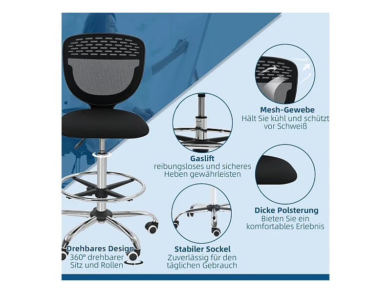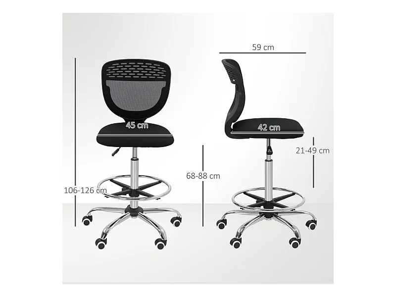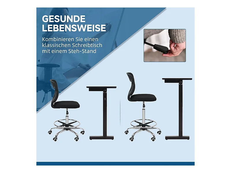 Tabouret de travail pivotant et réglable avec dossier, roulettes et repose-pieds ajustable, cuir synthétique noir, idéal pour bureau
