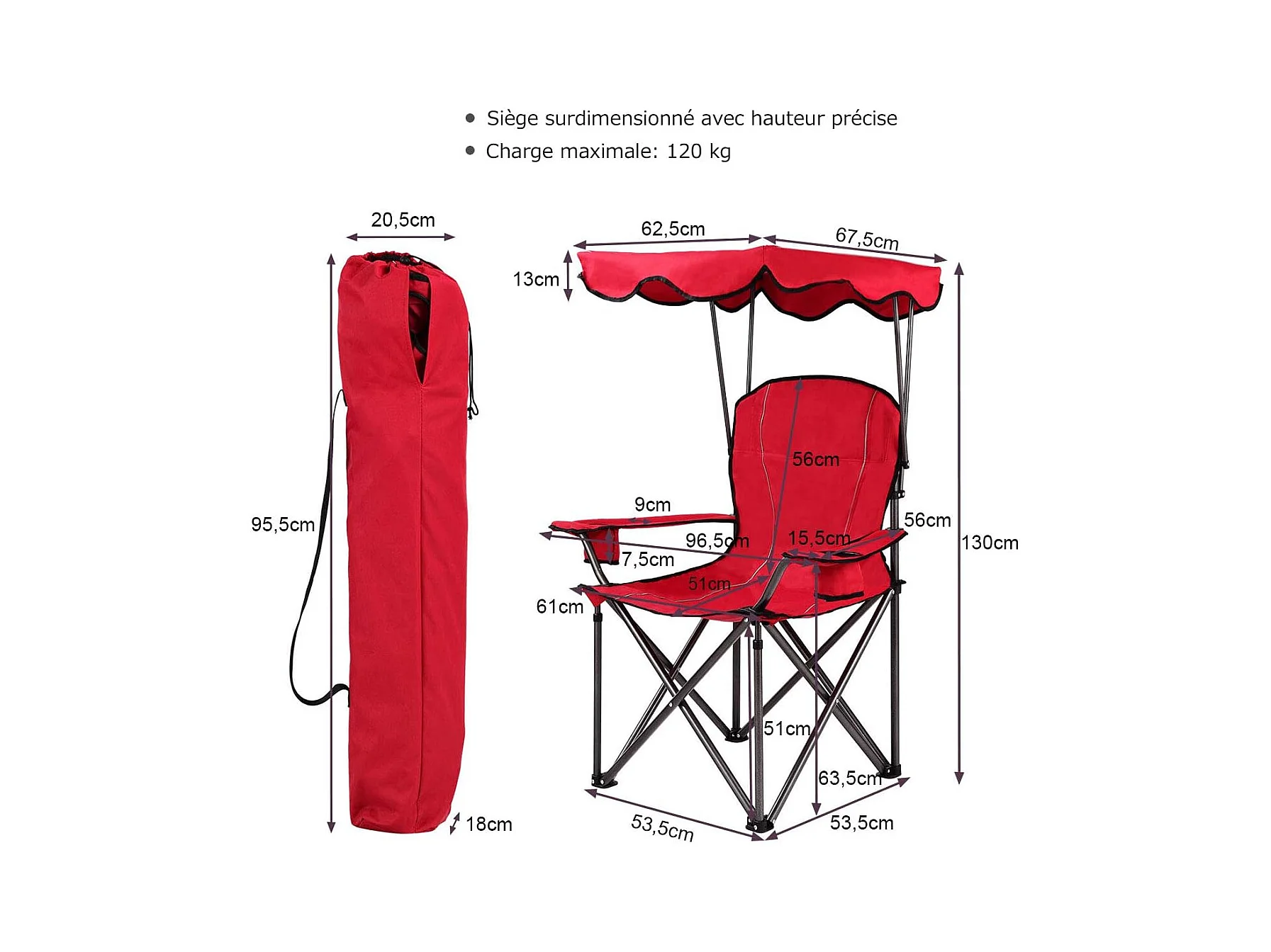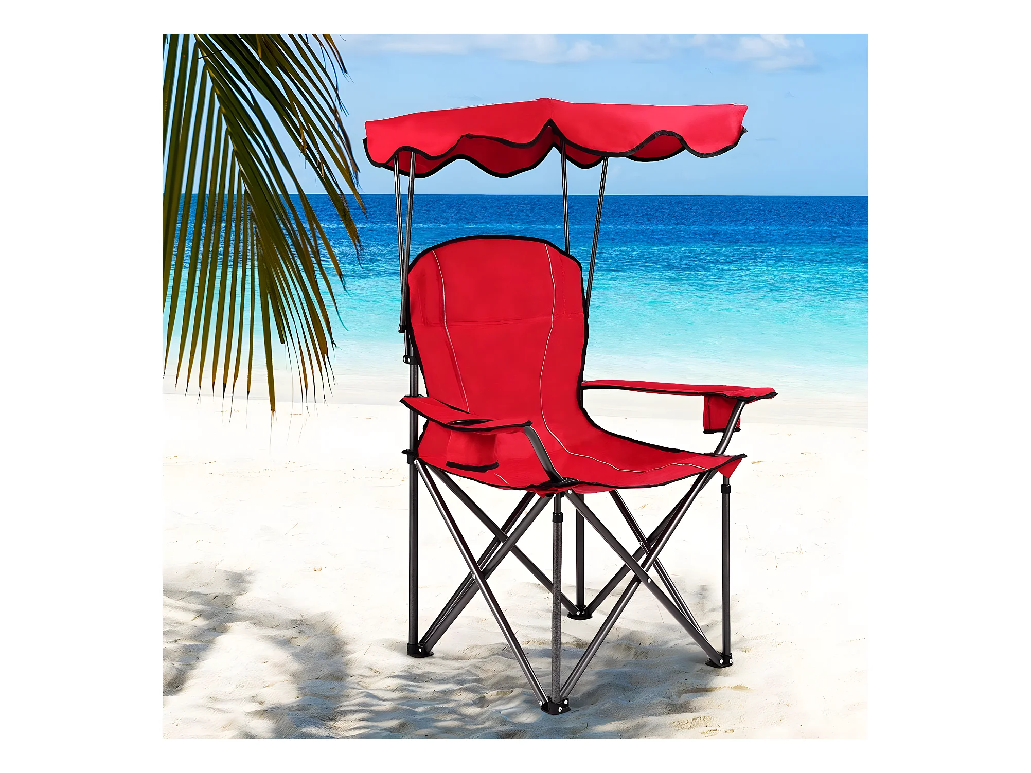 Chaise de CamBoisg avec Parasol/Chaise de Plage Pliante avec Porte-gobelet,Accoudoirs Portable 120 KG pour Plage,Pêche Rouge