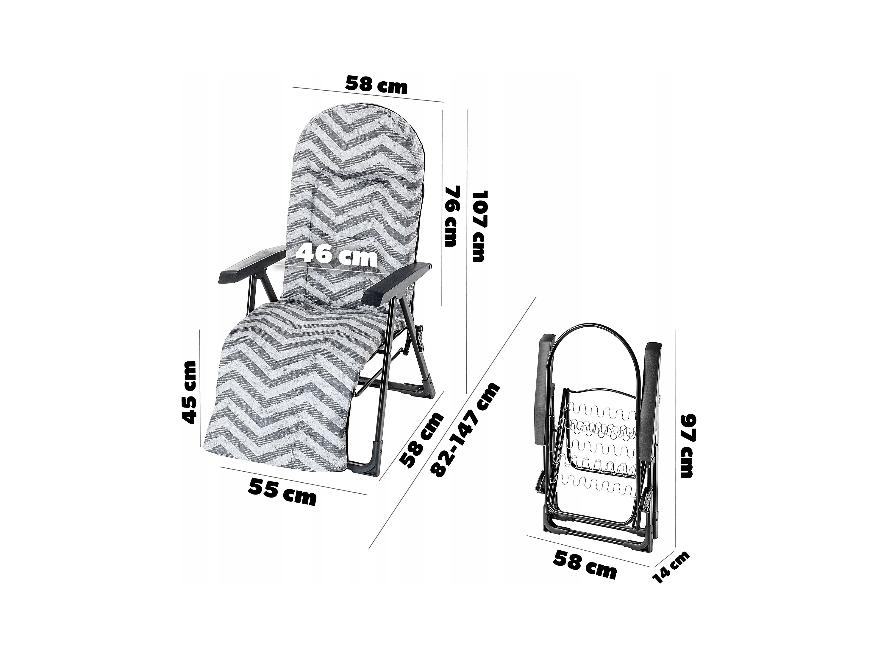 Chaise de jardin KADAX avec dossier réglable, chaise relax en acier thermolaqué, chaise pliante avec capacité de charge jusqu'à 110 kg, chaise longue avec coussin
