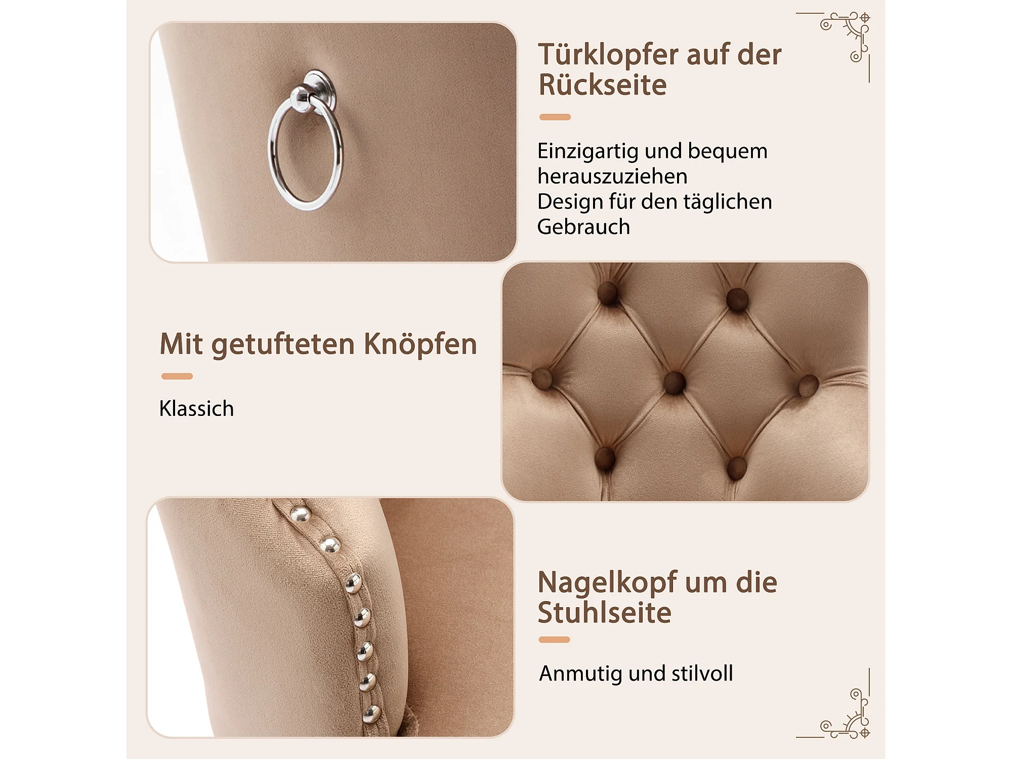 Chaise de salle à manger avec accoudoirs, tissu en velours, pieds en bois massif, design rétro avec anneau de porte, couleur marron (53x46.5x95 cm)