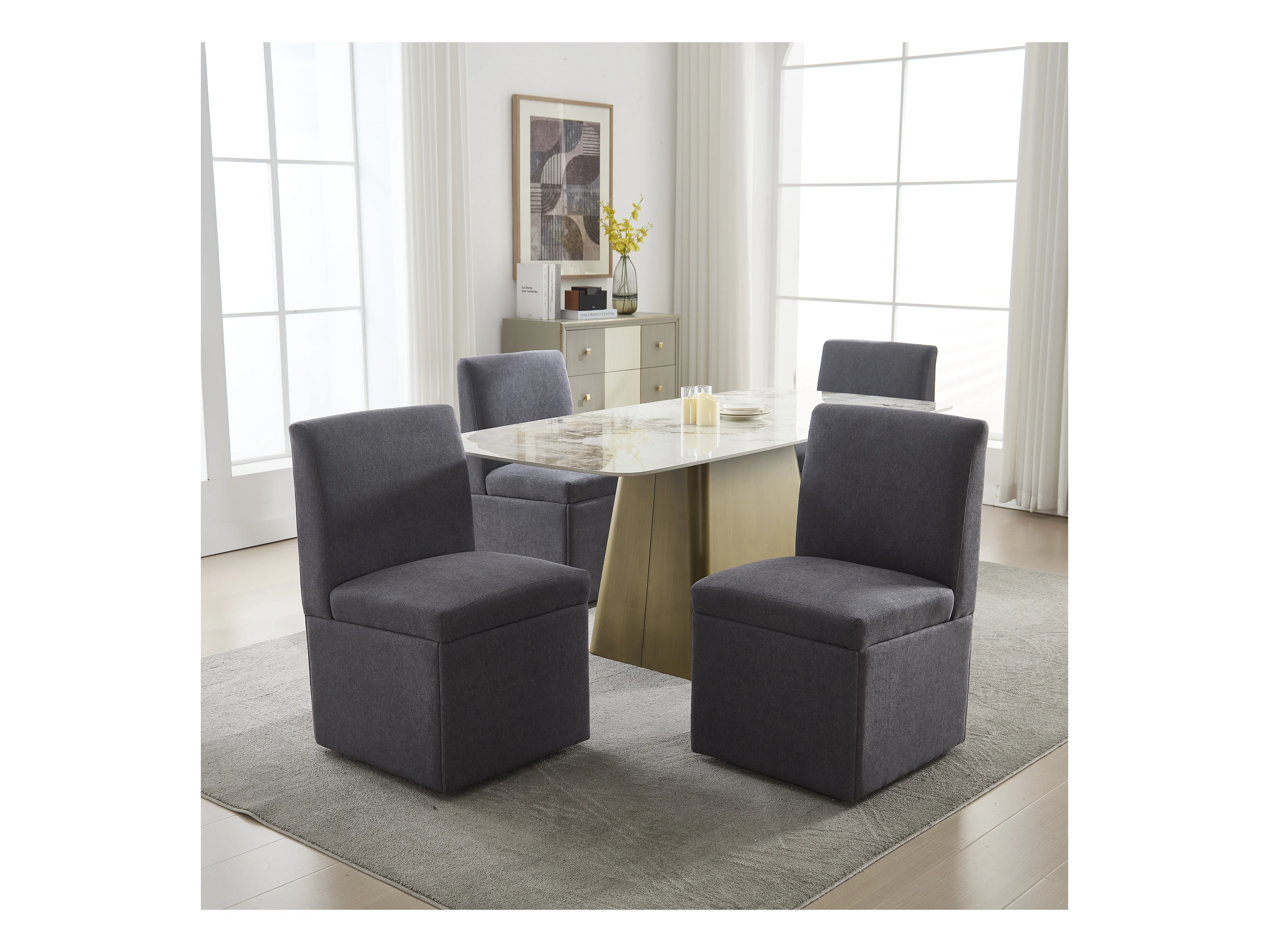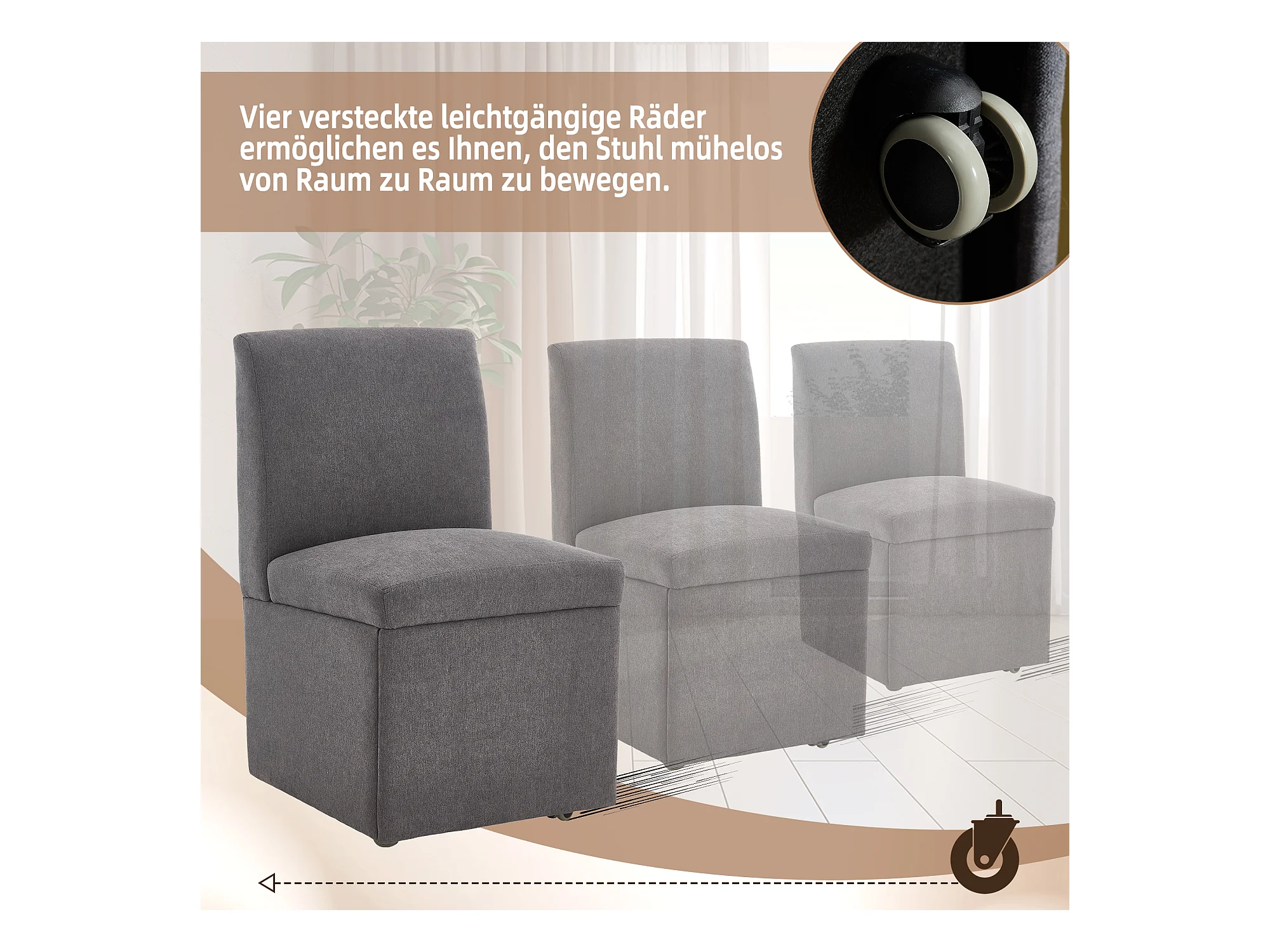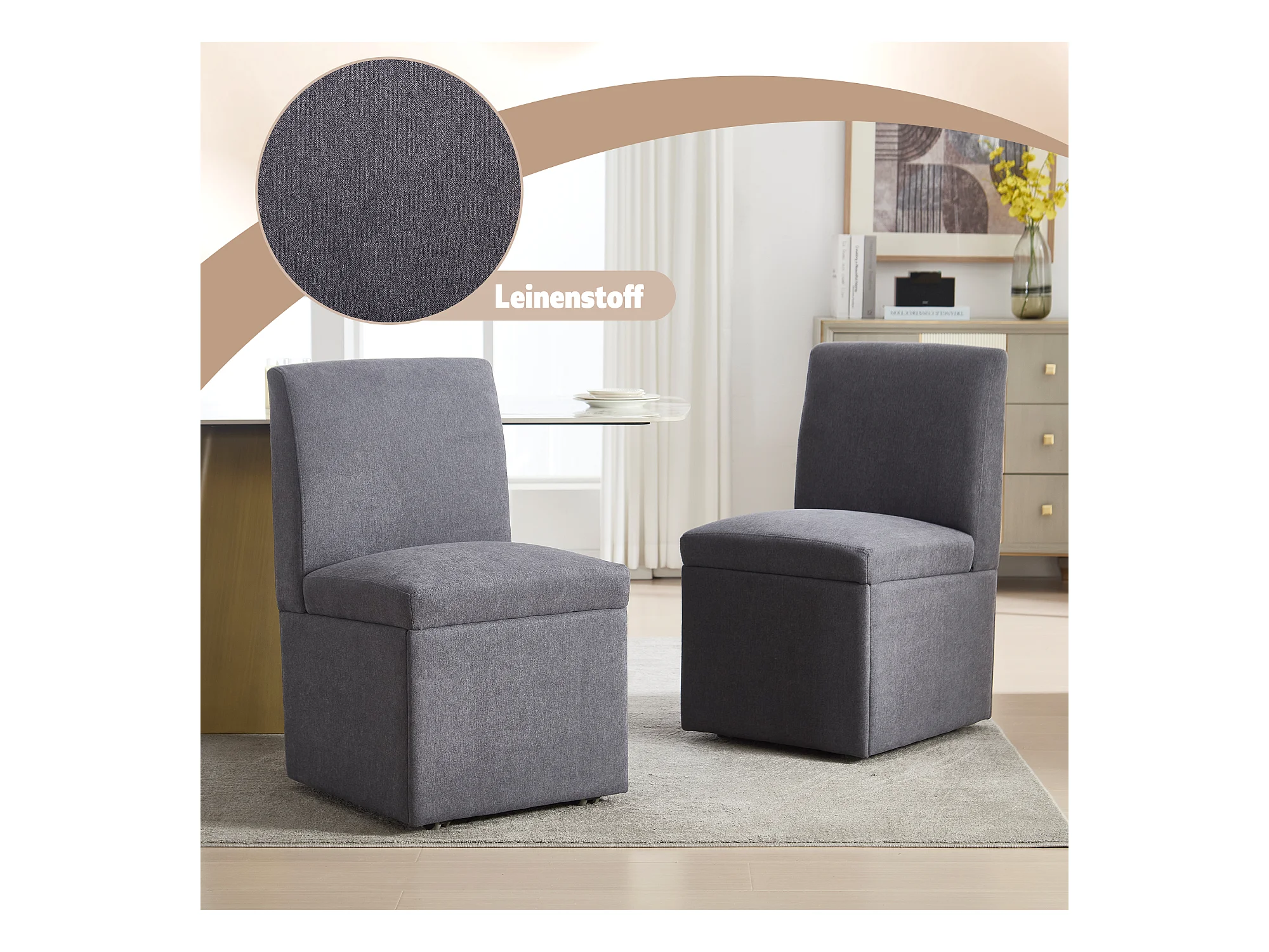 Chaise de salle à manger avec roulettes, fauteuil pivotant et rangement, tissu lin gris foncé, fauteuil moderne sans bras (50x59x86 cm)