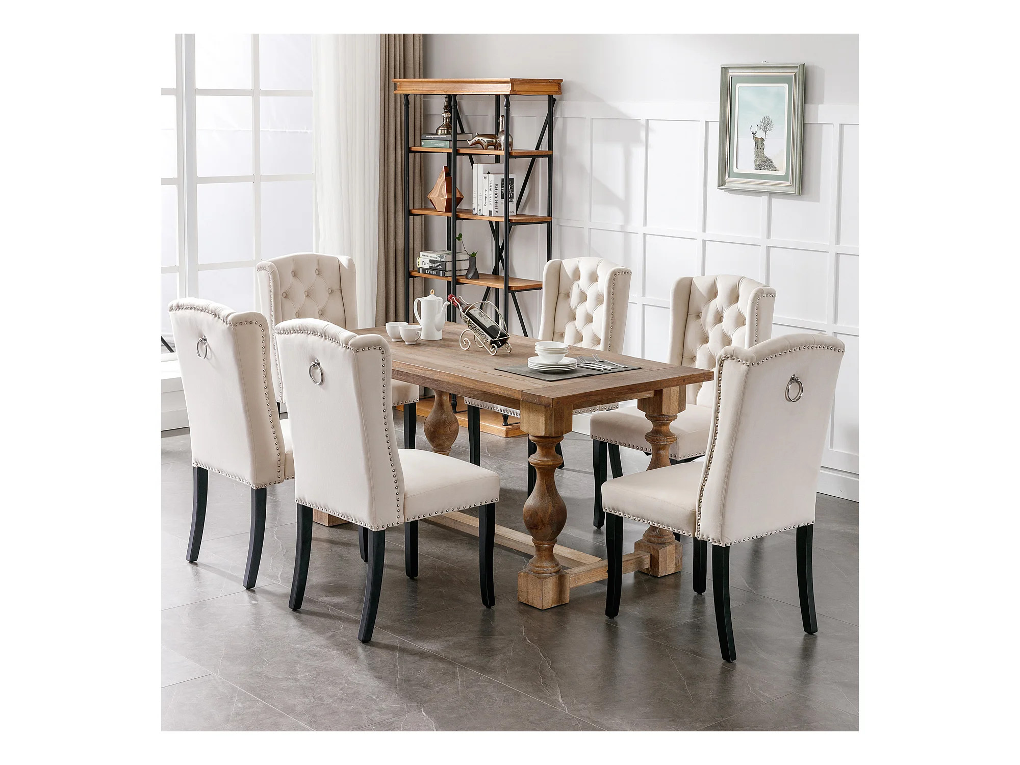 Chaise de salle à manger en velours, 6 pièces, pieds en chêne, boutons et clous métalliques, beige (L 104.67 x l 46.99 x H 36.2 cm)