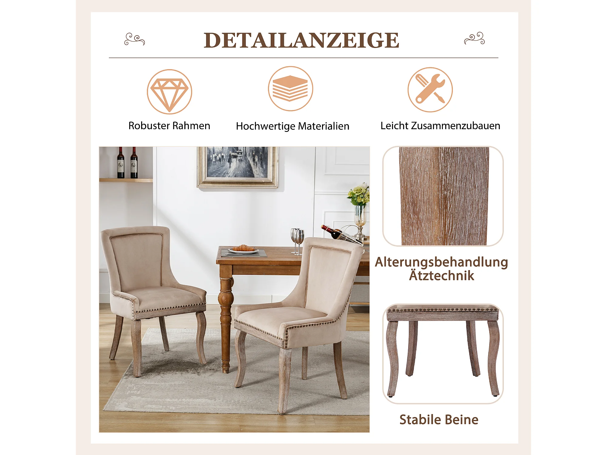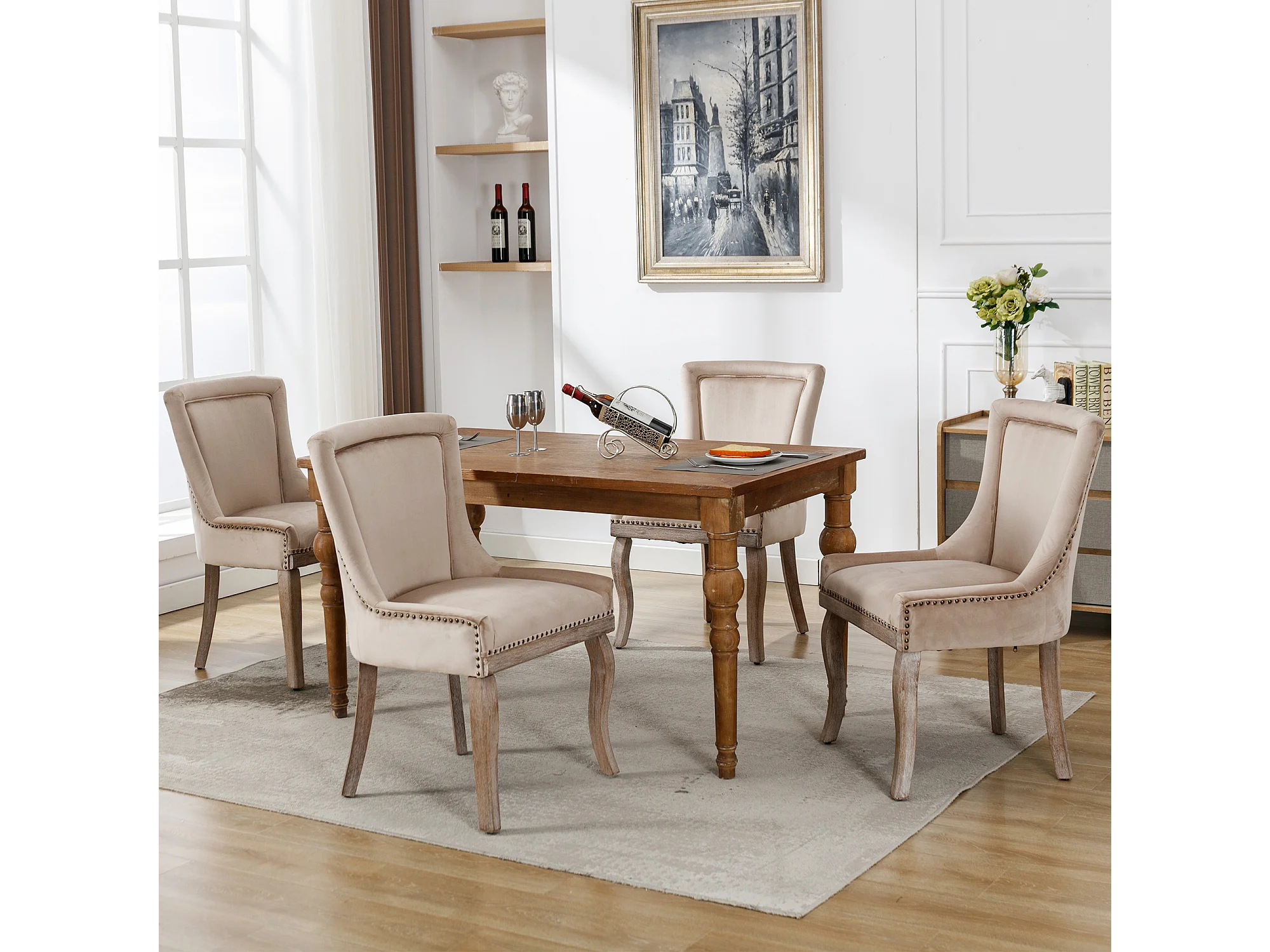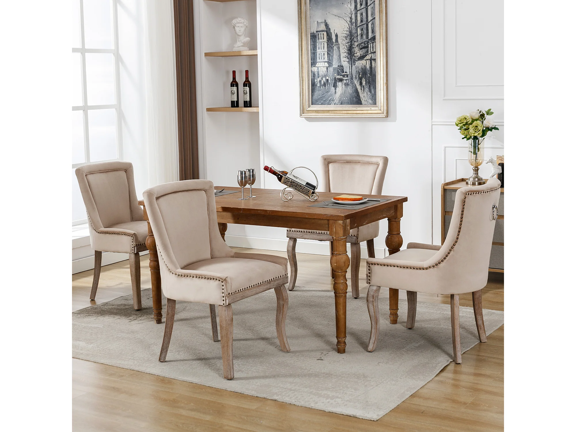 Chaise de salle à manger en velours beige avec pieds en bois massif et clous décoratifs (55x61x91 cm)
