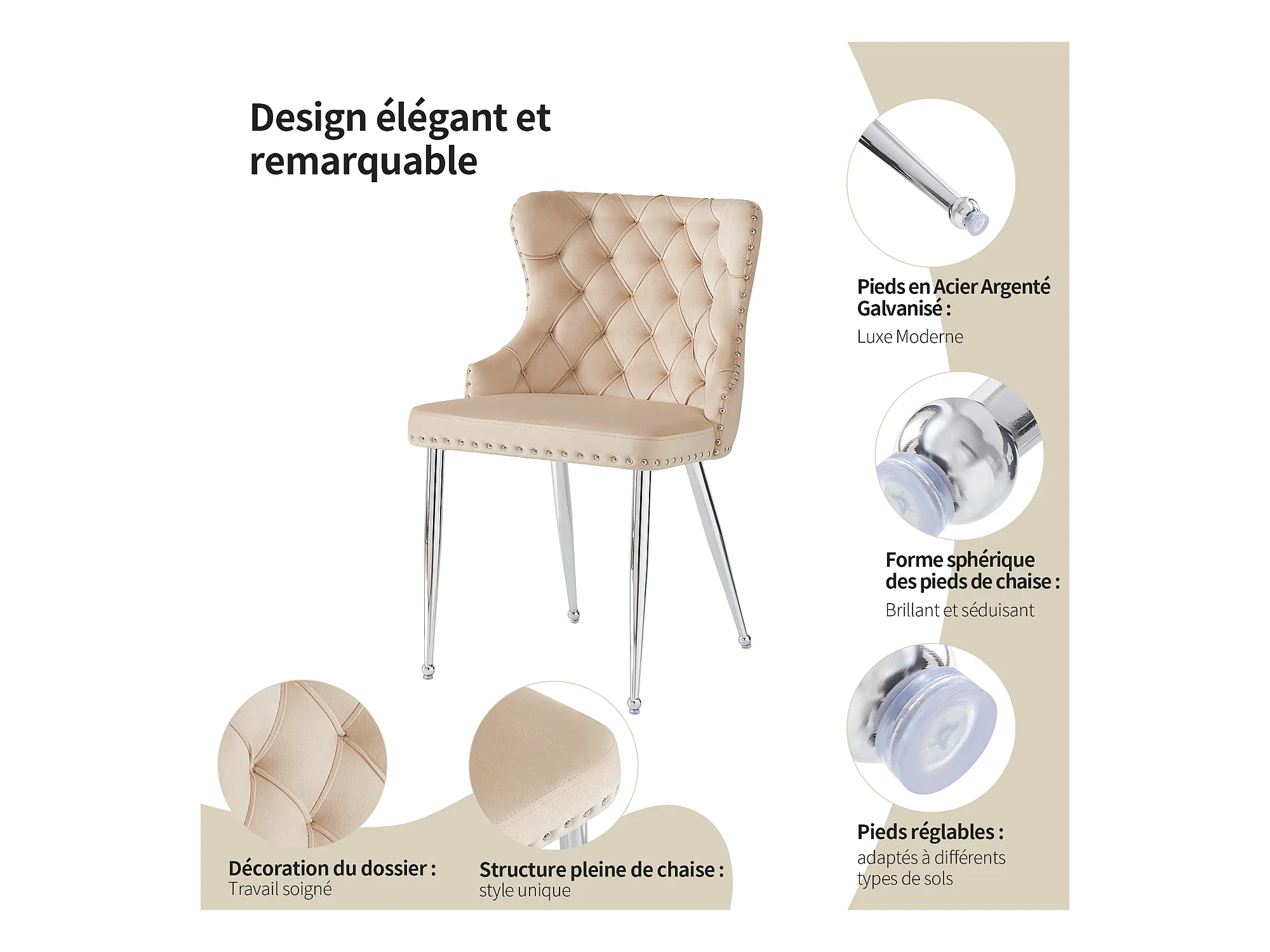 Chaise de salle à manger en velours, design ergonomique avec pieds argentés réglables, beige (54x54x85.5cm)