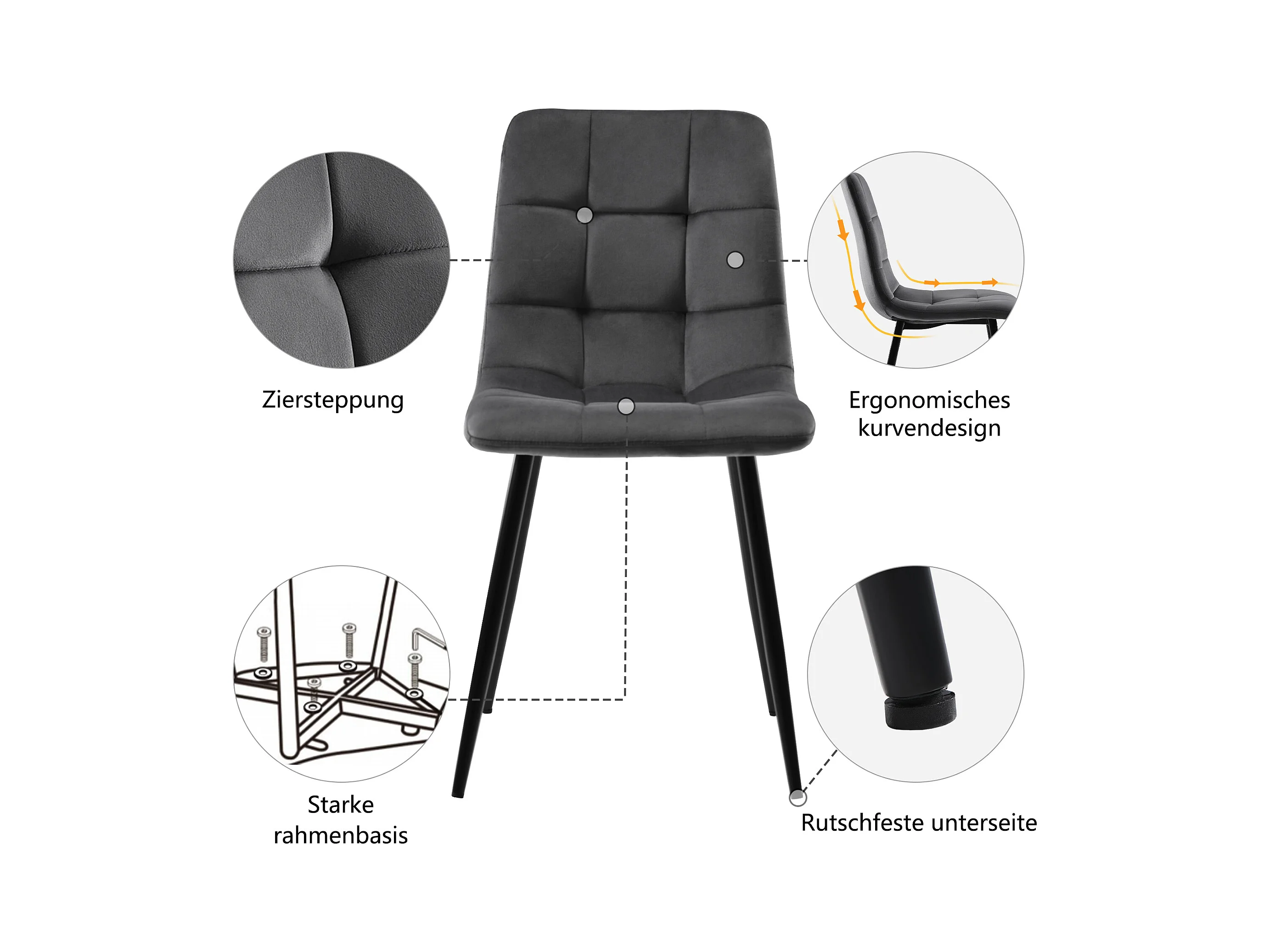 Chaise de salle à manger en velours, design moderne, structure en métal, gris (44x41x86 cm)