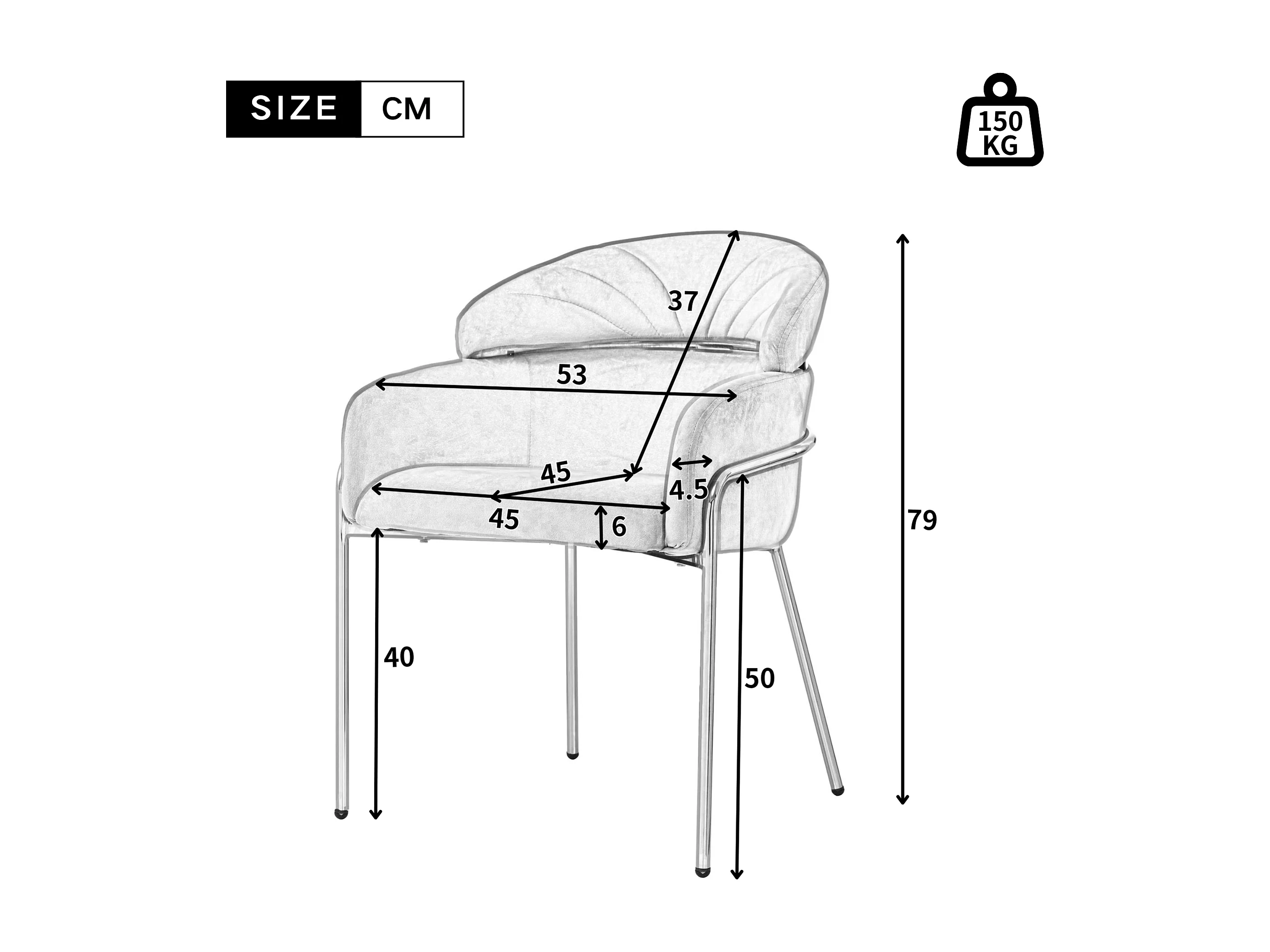 Chaise de salle à manger, individuelle, en velours, avec pieds métalliques, gris (59.69x59.69x55.88 cm)