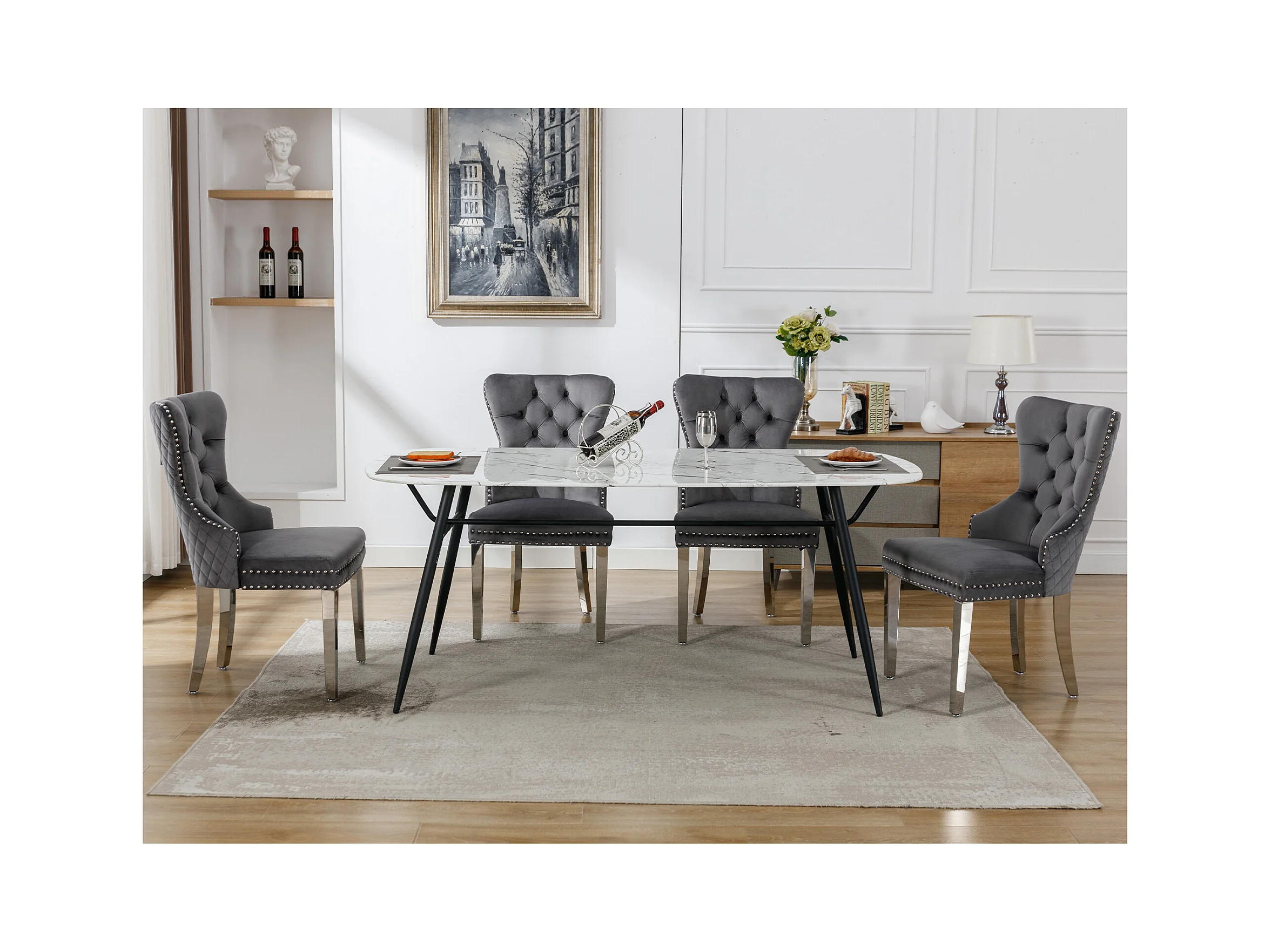 Ensemble de 4 chaises de salle à manger, tapissées avec garniture cloutée, pieds de support en métal, revêtement en velours, gris, avec motif heurtoir de porte