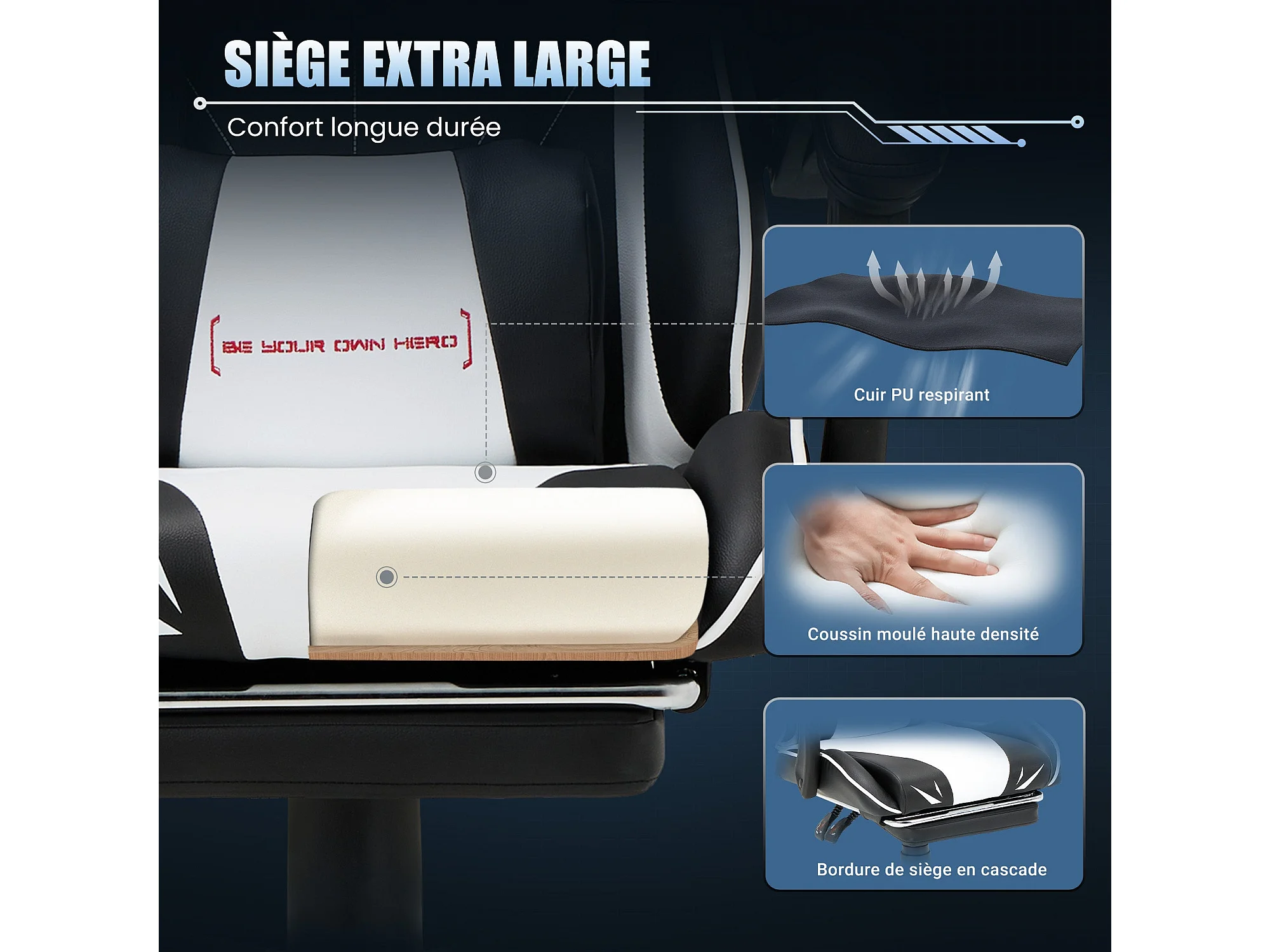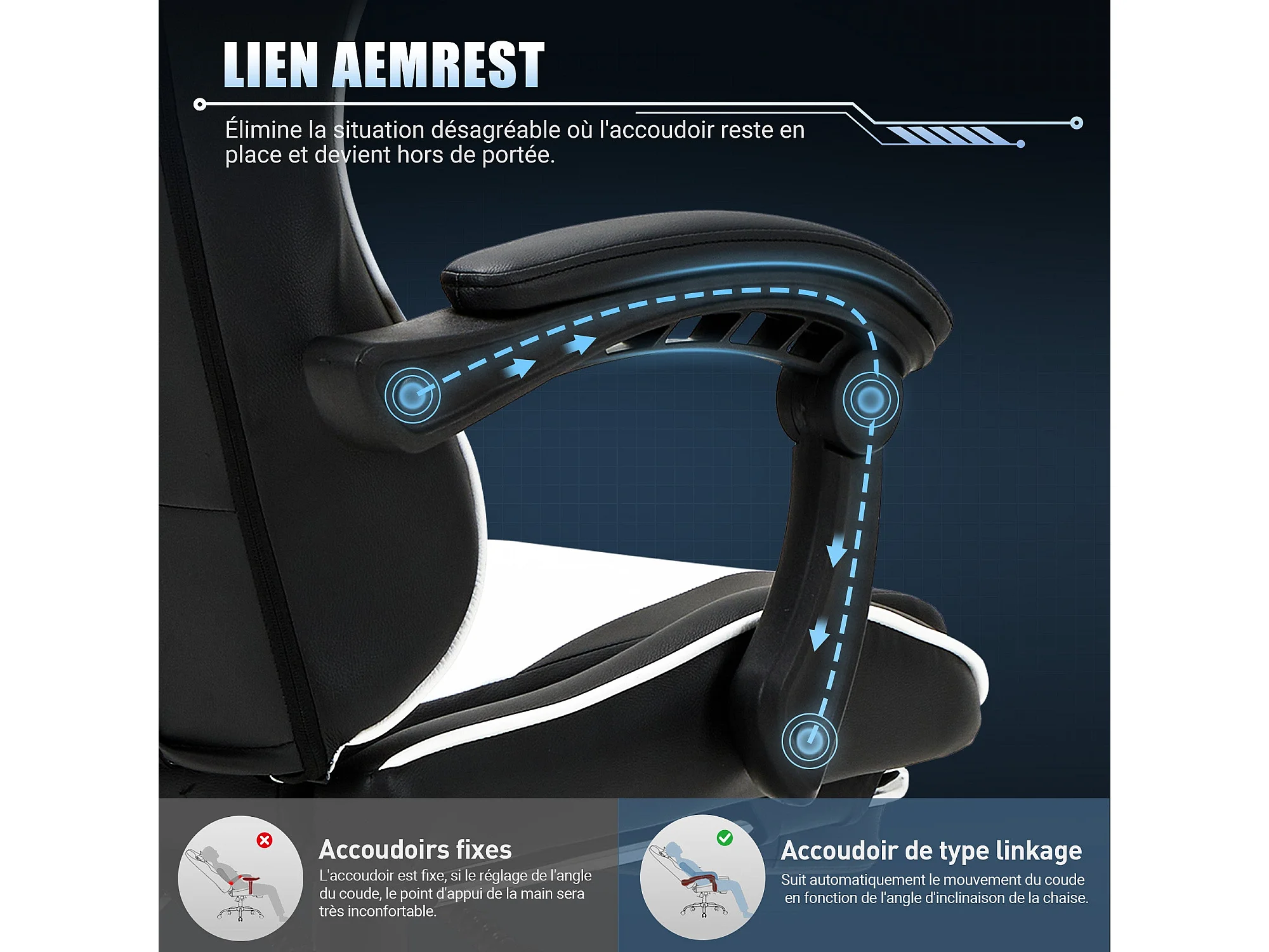 Chaise gaming ergonomique, avec repose-pieds, capacité de charge maximale 136kg – Blanc