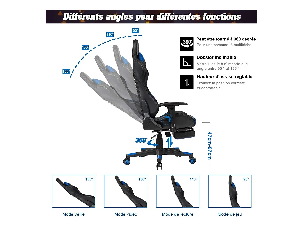 Chaise de Bureau/Chaise Gaming Réglable à Dossier Inclinable de 90°-160° avec Appui-tête, Renfort Lombaire et Accoudoirs Rembourrés Bleu