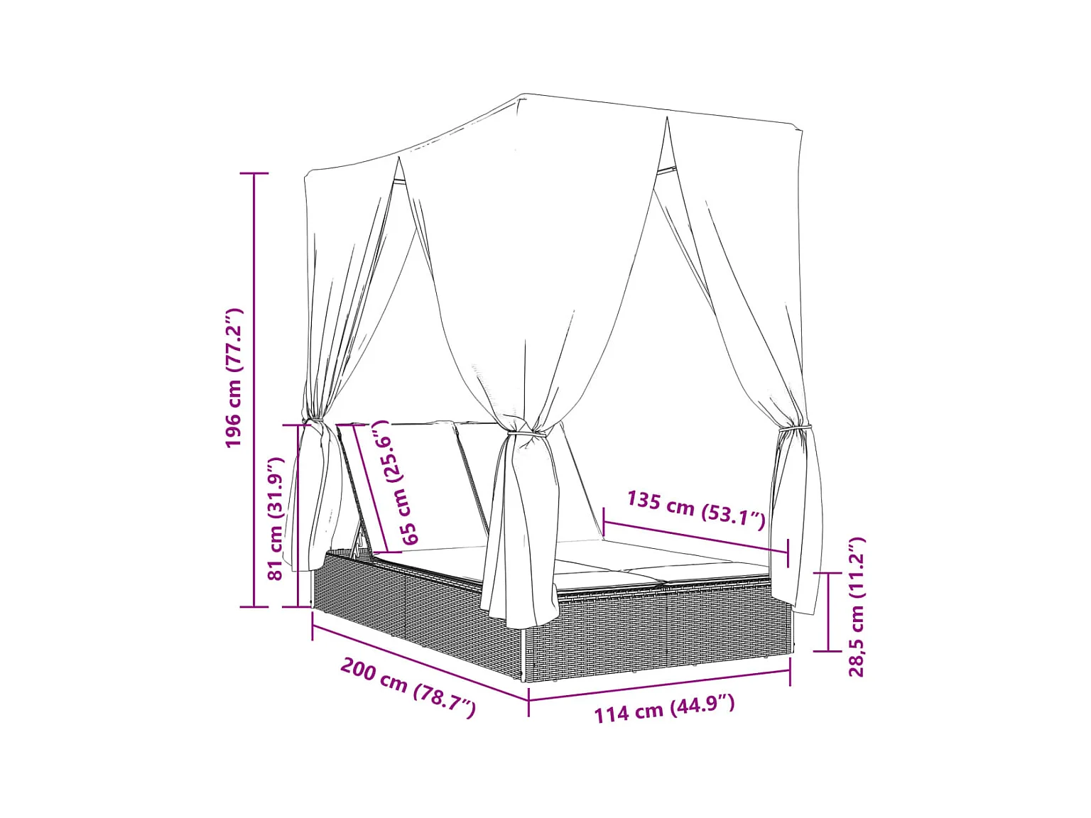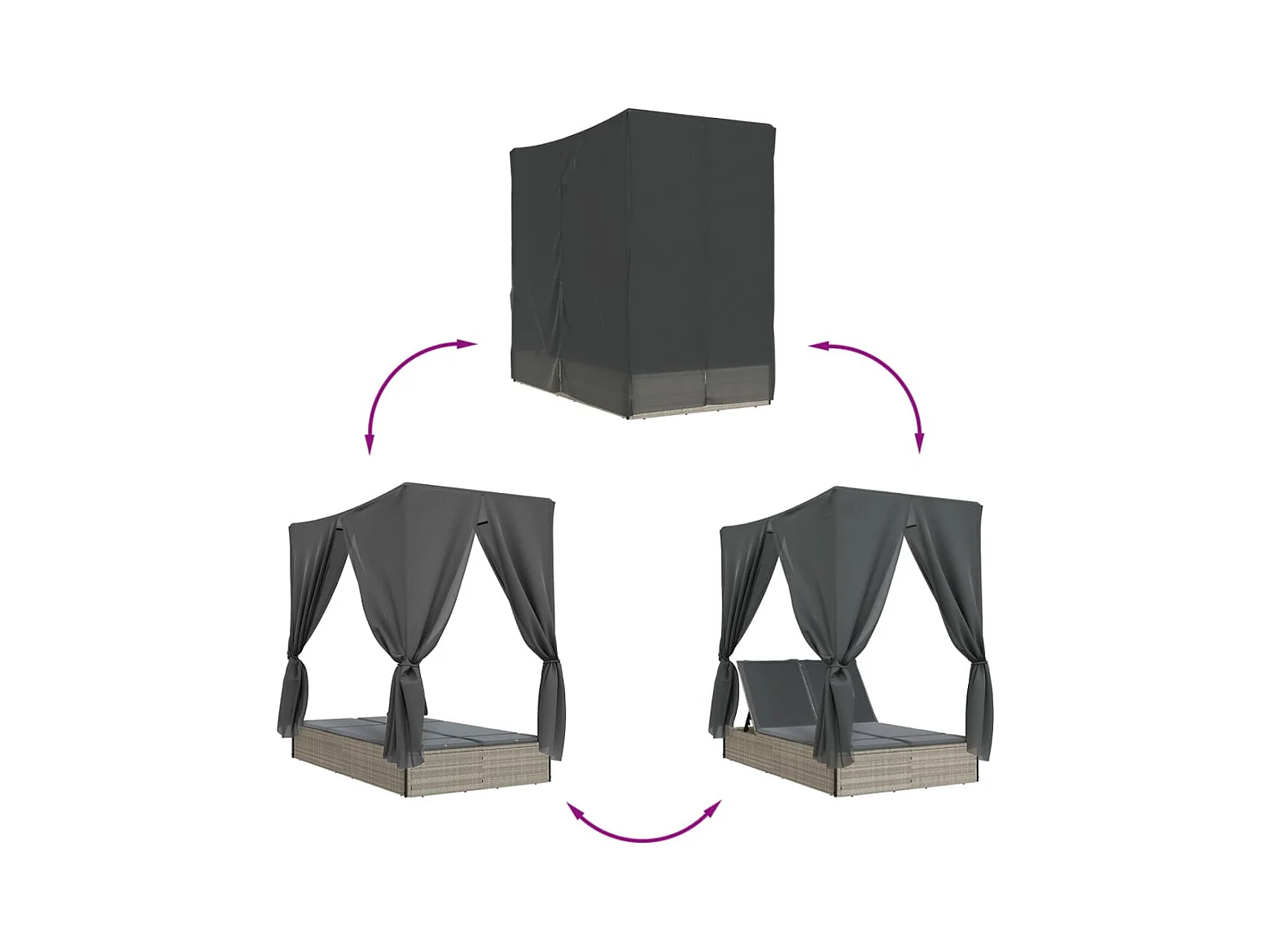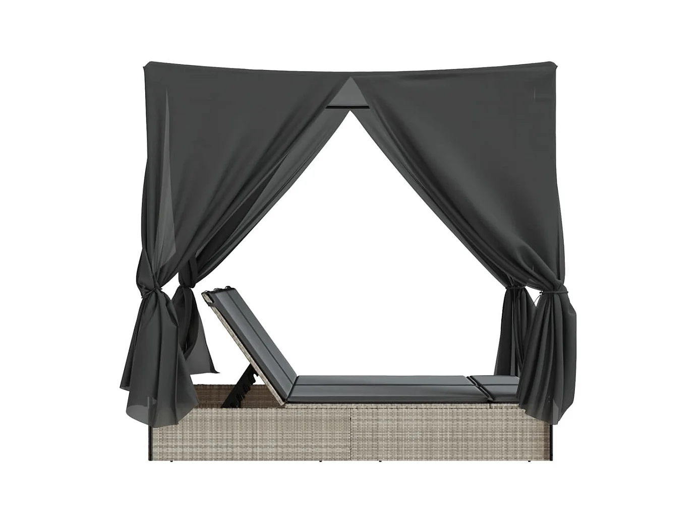Chaise longue double avec toit et rideaux gris clair poly rotin