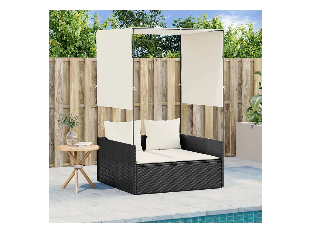 Chaise longue double avec toit et rideaux noir résine tressée