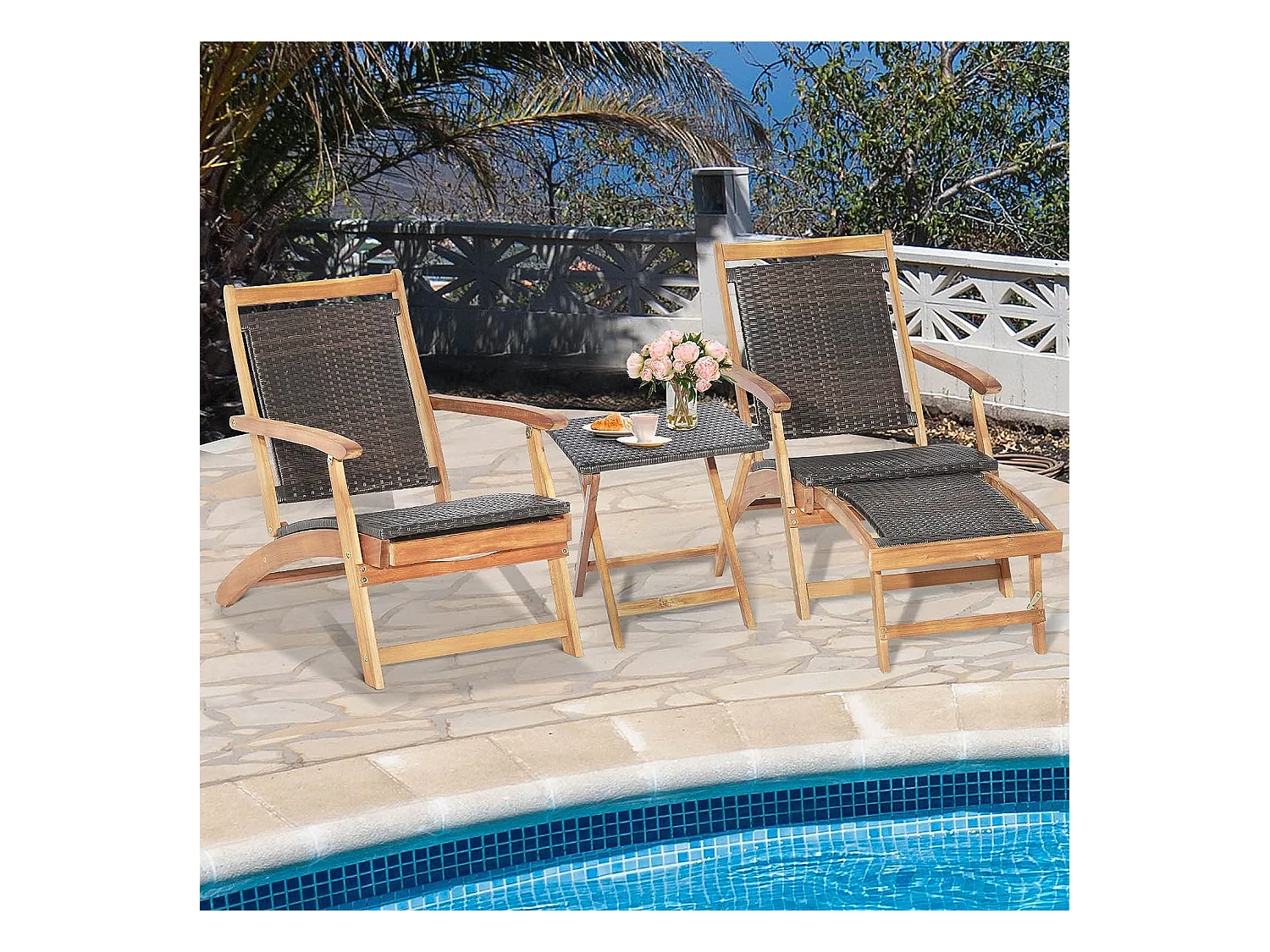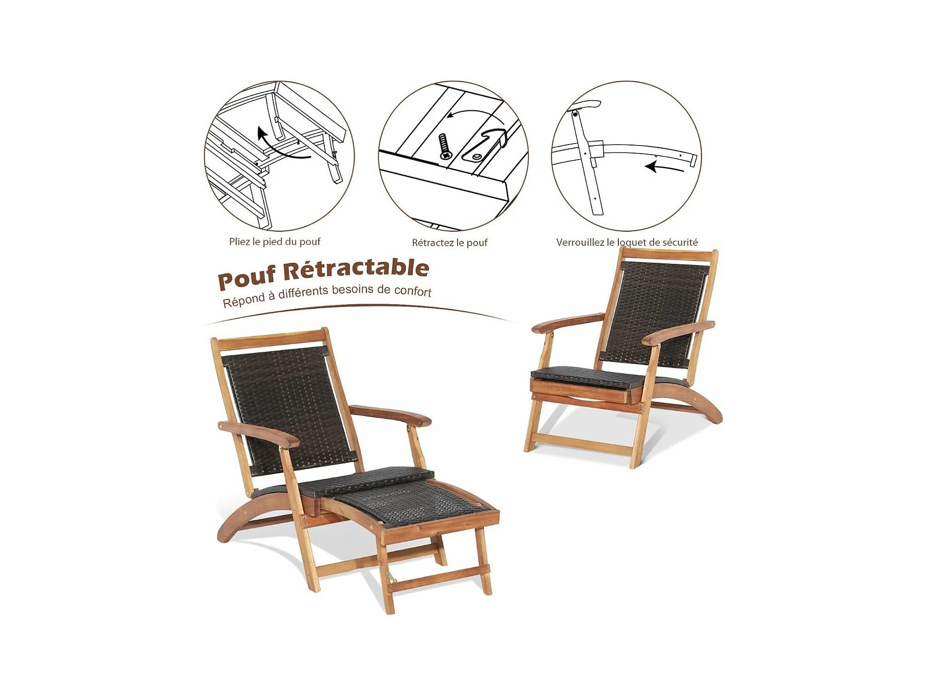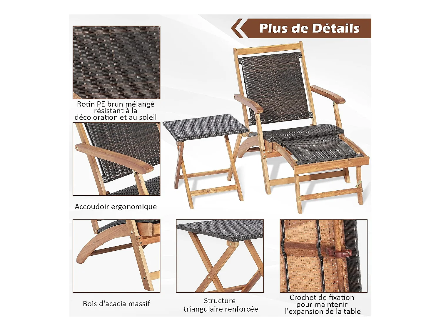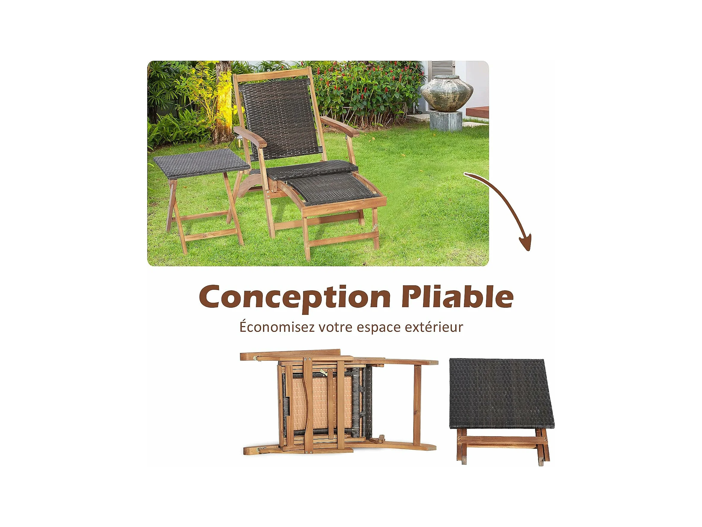 Chaise Longue en Rotin avec Table d'Appoint, Fibre naturelle et Bois d'Acacia Certifié FSC avec Repose-Pied Rétractable et Accoudoirs Charge 160KG, Bain de Soleil avec Table d'Appoint Carré Pliable Extérieur