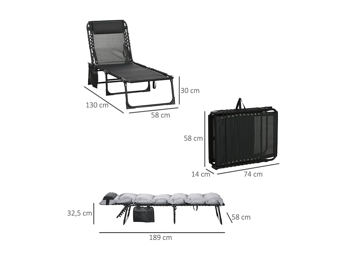 Chaise longue pliable avec coussin, 5 positions réglables, cadre en métal, polyester, gris clair (58x189x32.5 cm)