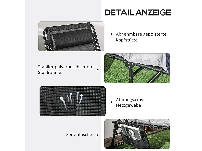 Chaise longue pliable, avec coussin et poche latérale, en métal et tissu Oxford, gris (188x64.5x53 cm)