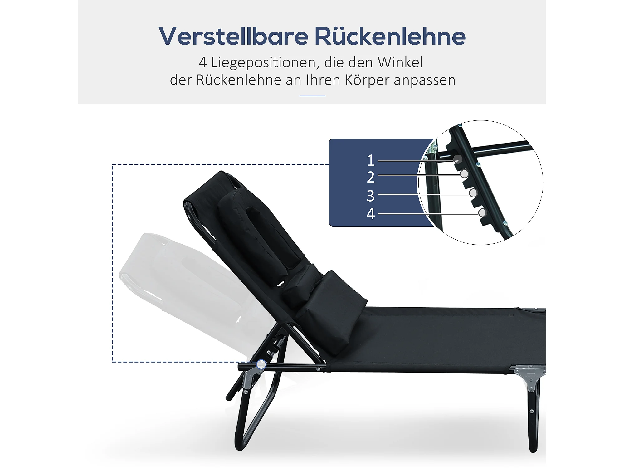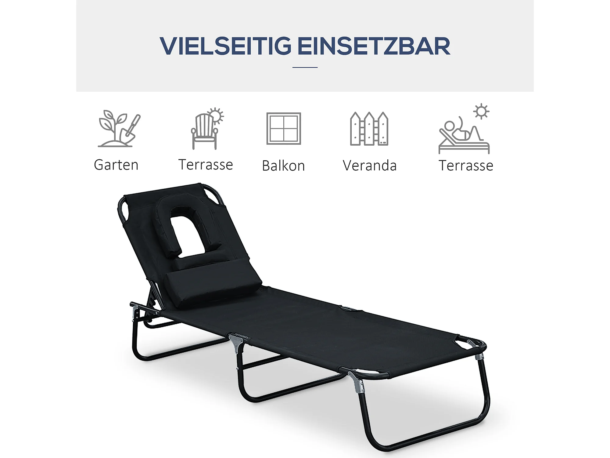 Chaise longue pliable avec ouverture visage et fenêtre lecture, tissu oxford, noir (190x56x28cm)