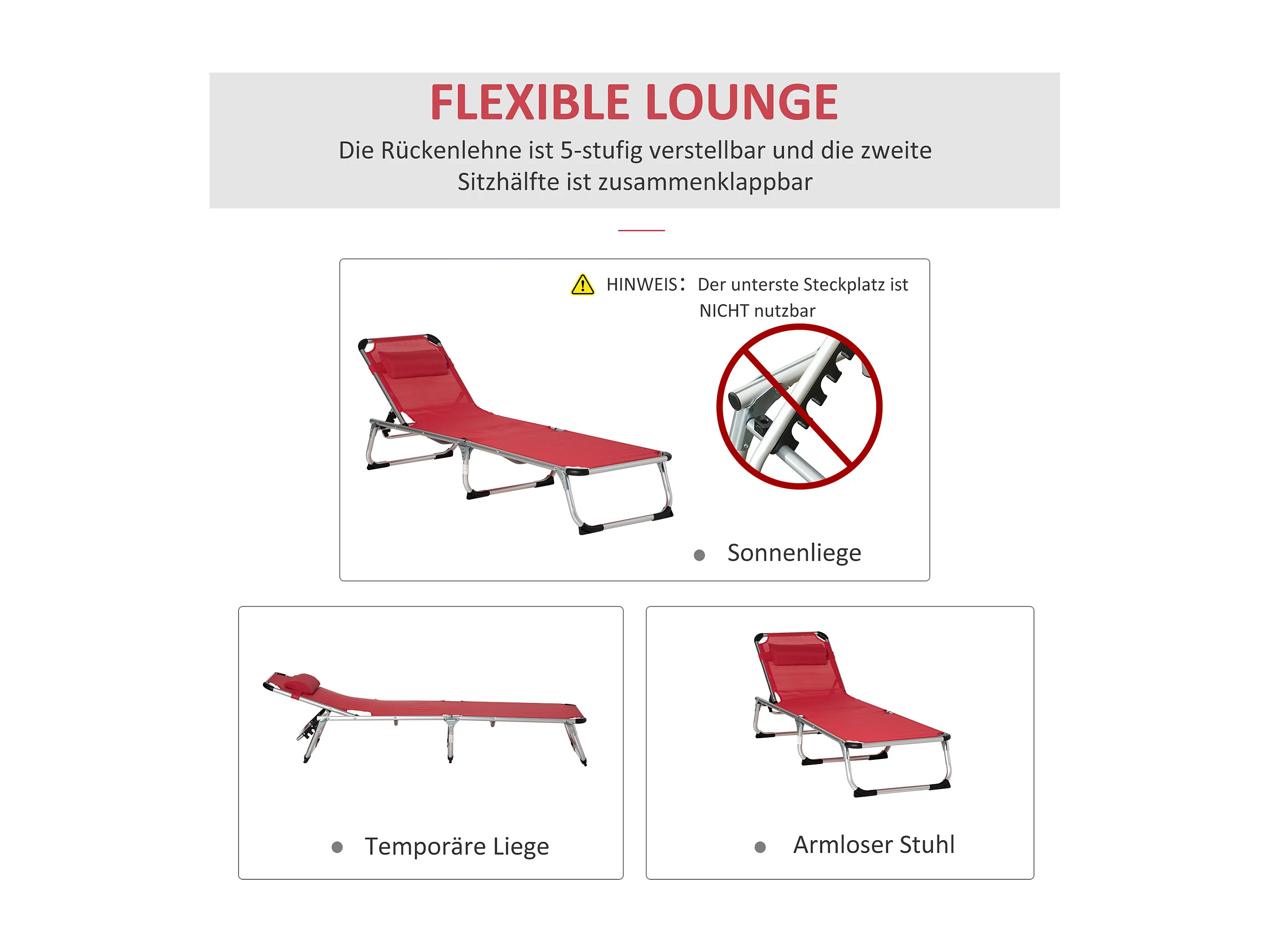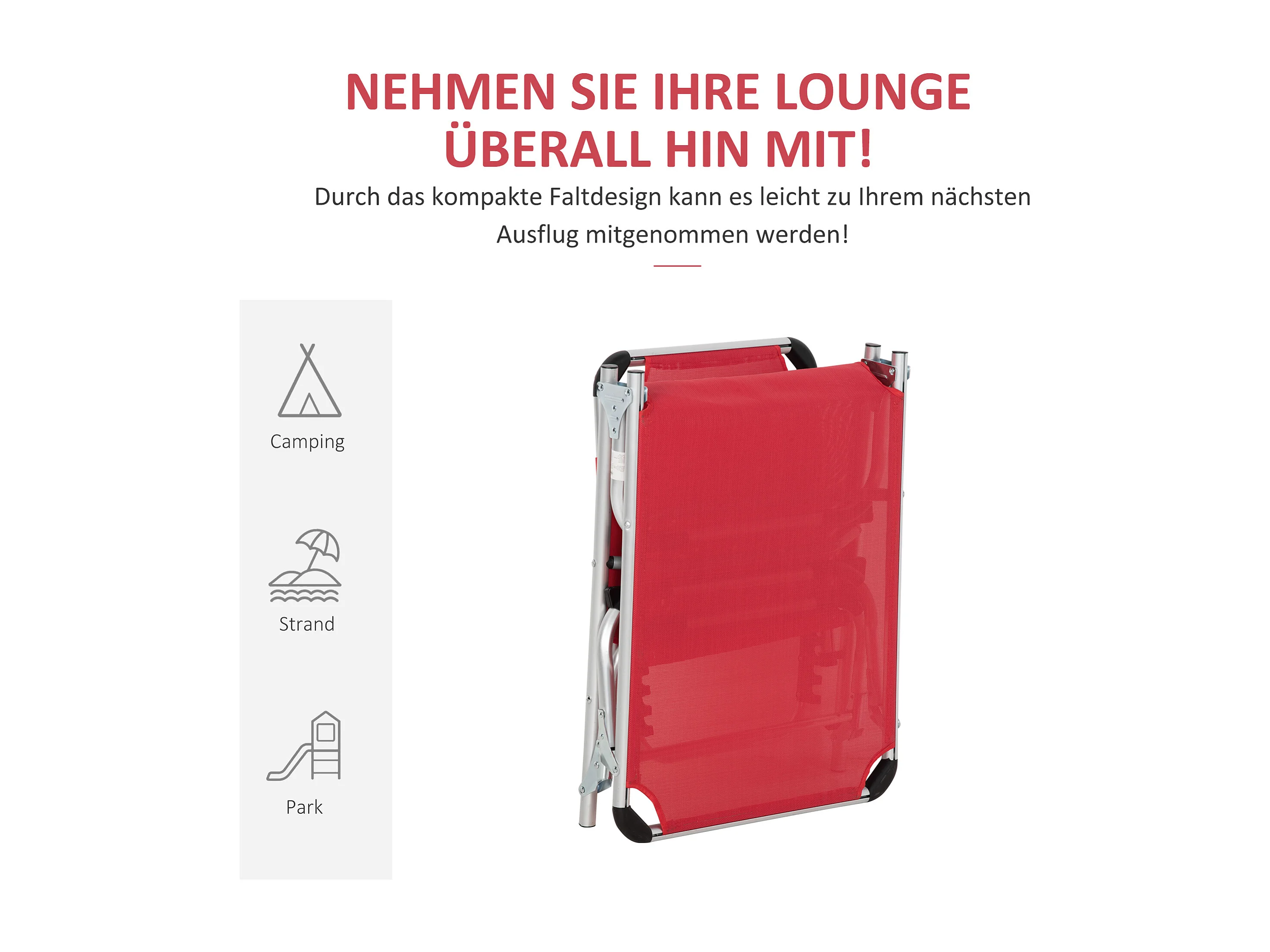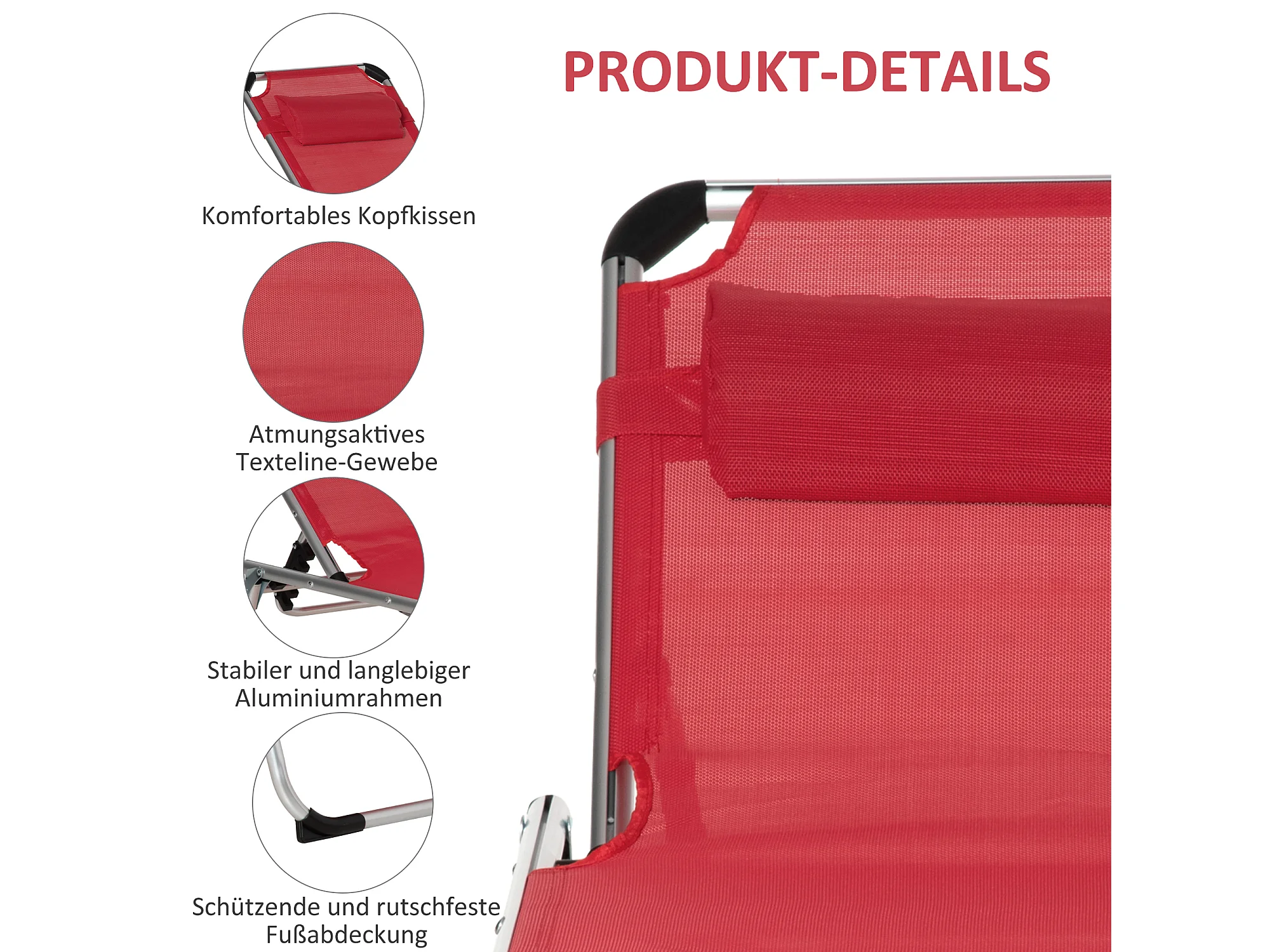 Chaise longue pliable ergonomique 5 positions, aluminium, tissu maille rouge (165x60x76cm)