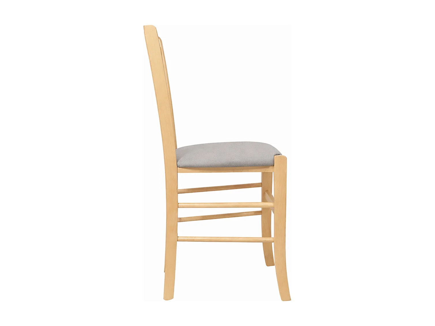 Chaise en bois vénitien naturel avec assise en similicuir gris clair