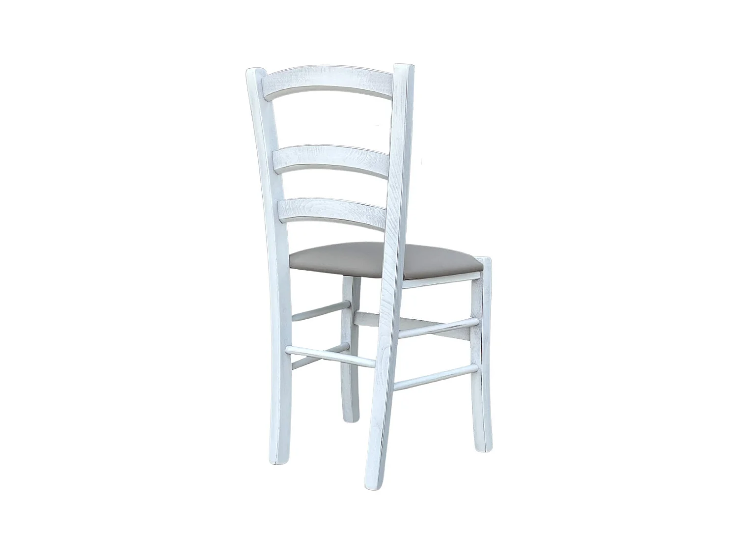 Chaise vénitienne antique en bois blanc avec assise en similicuir gris tourterelle