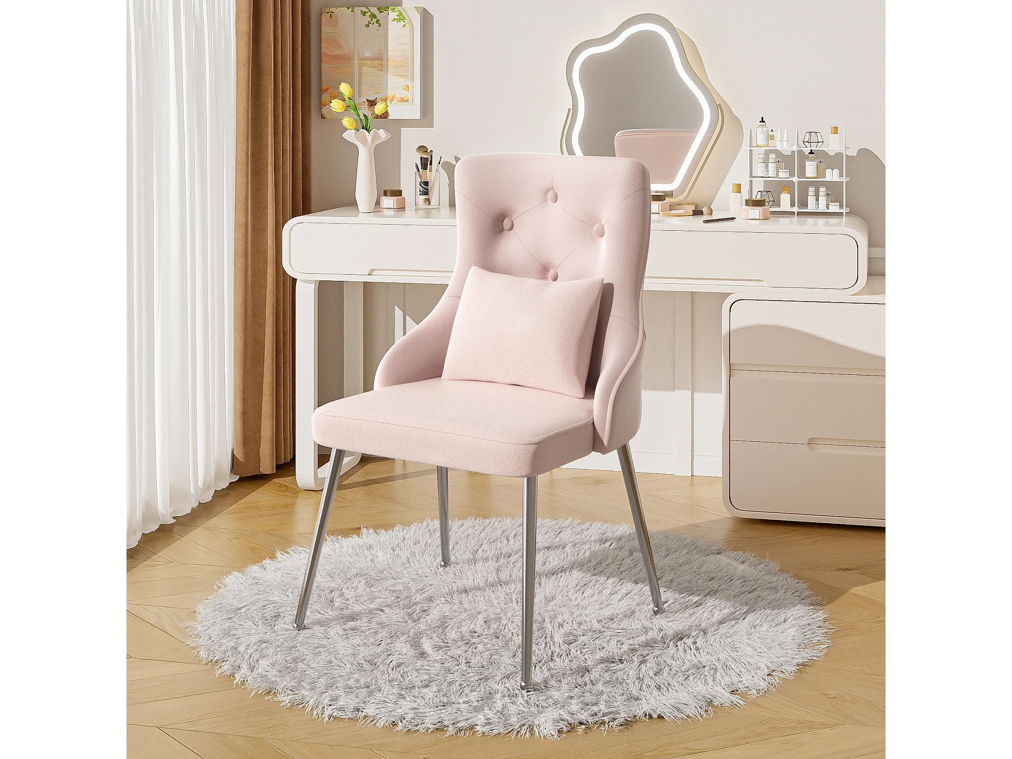 1 chaise à boutons rose avec coussin lombaire et pieds en métal,velours