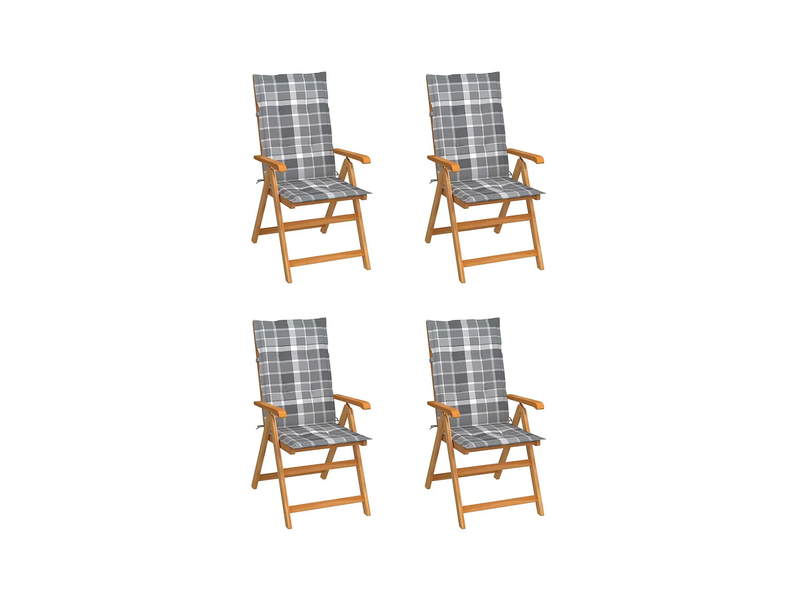 Chaises de jardin et coussins à carreaux gris 4 pièces Teck massif