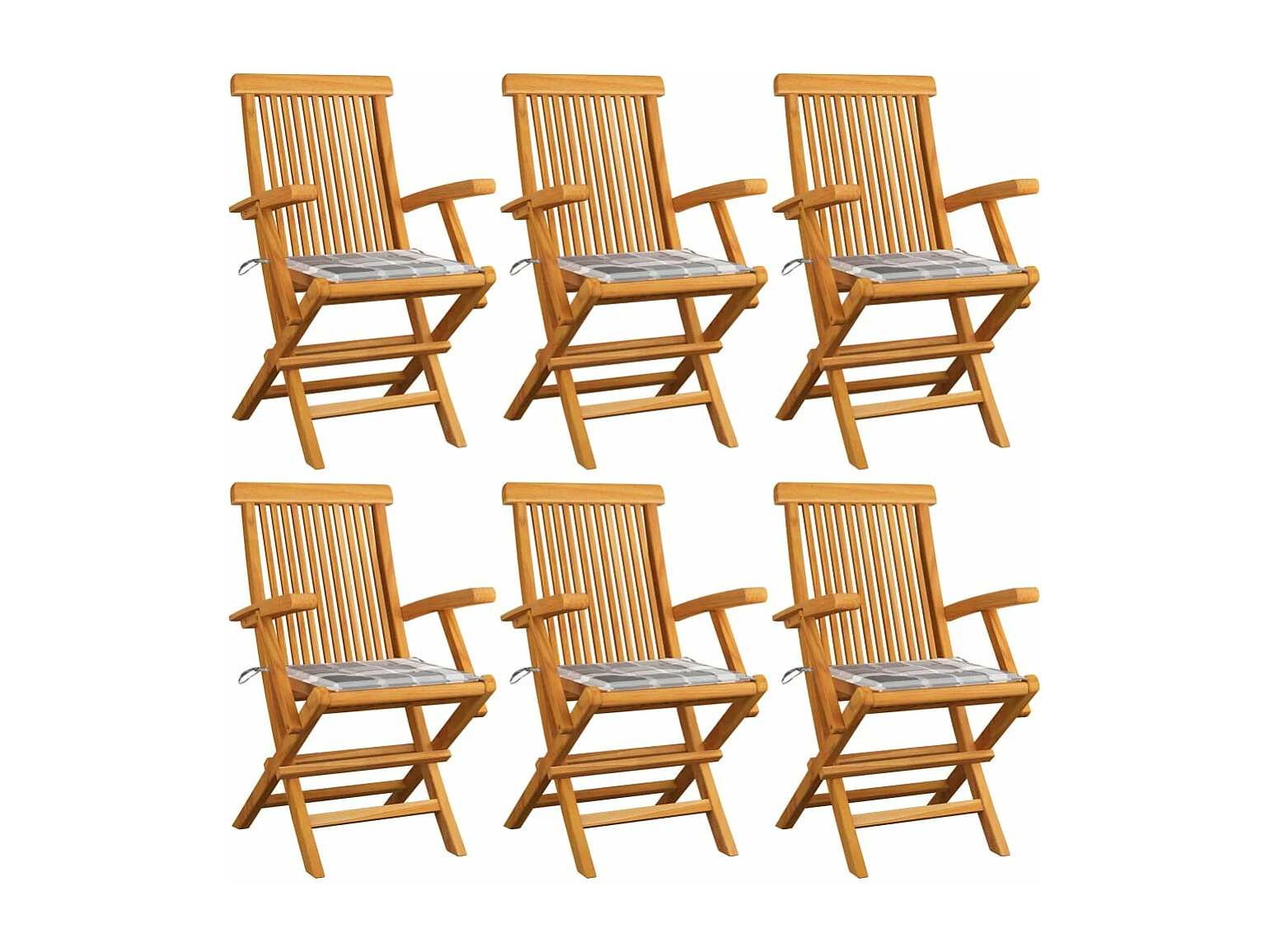Chaises de jardin et coussins à carreaux gris 6 pièces Teck massif