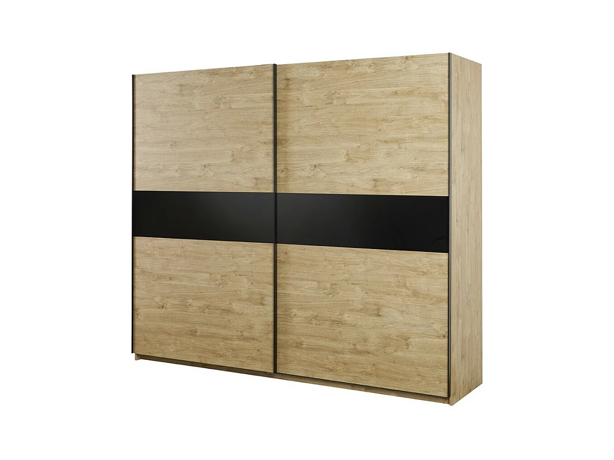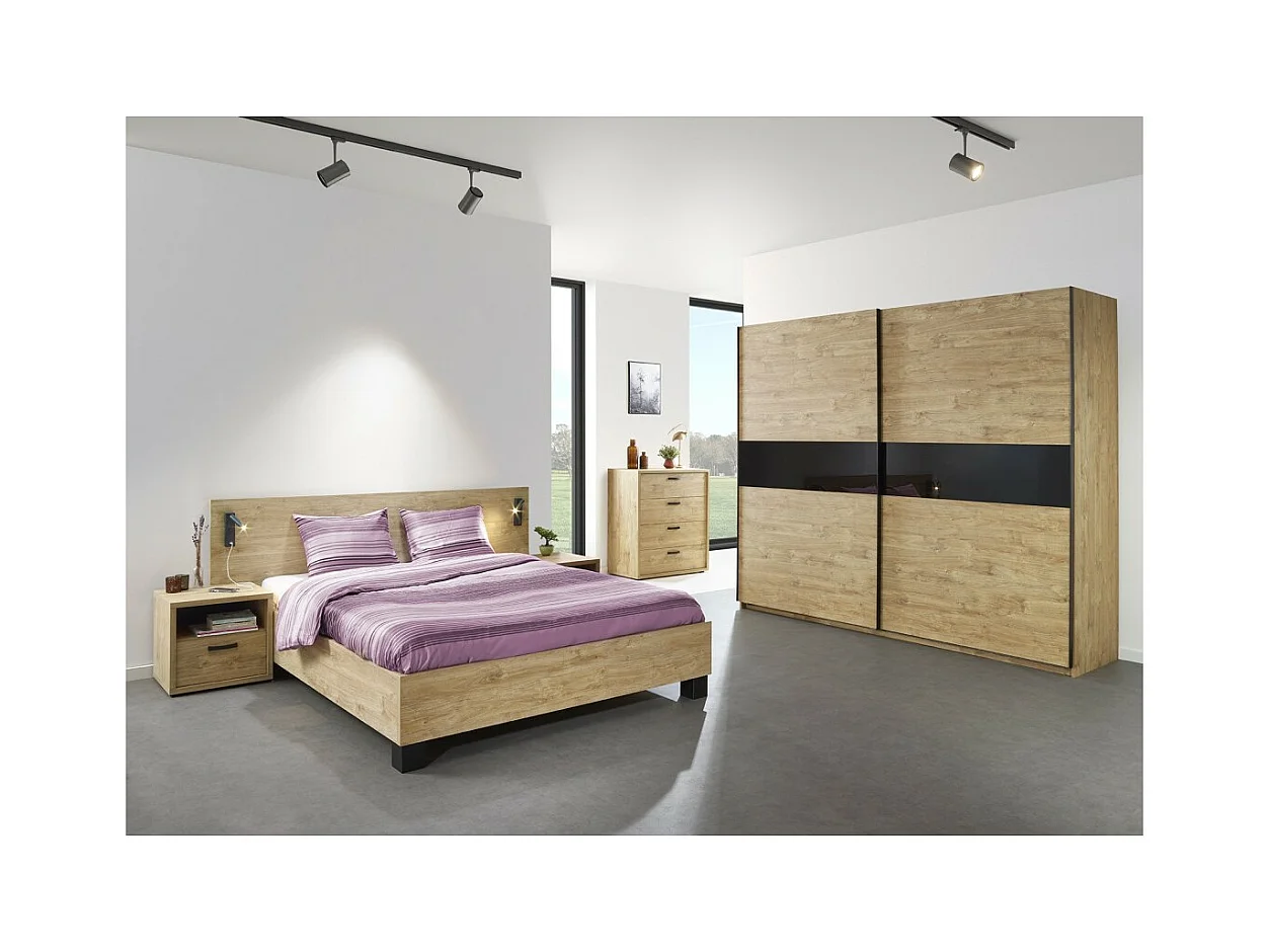 Chambre à coucher collection MORGANE : armoire 250 cm, lit avec applique 160x200, commode, chevets, chêne doré et noir