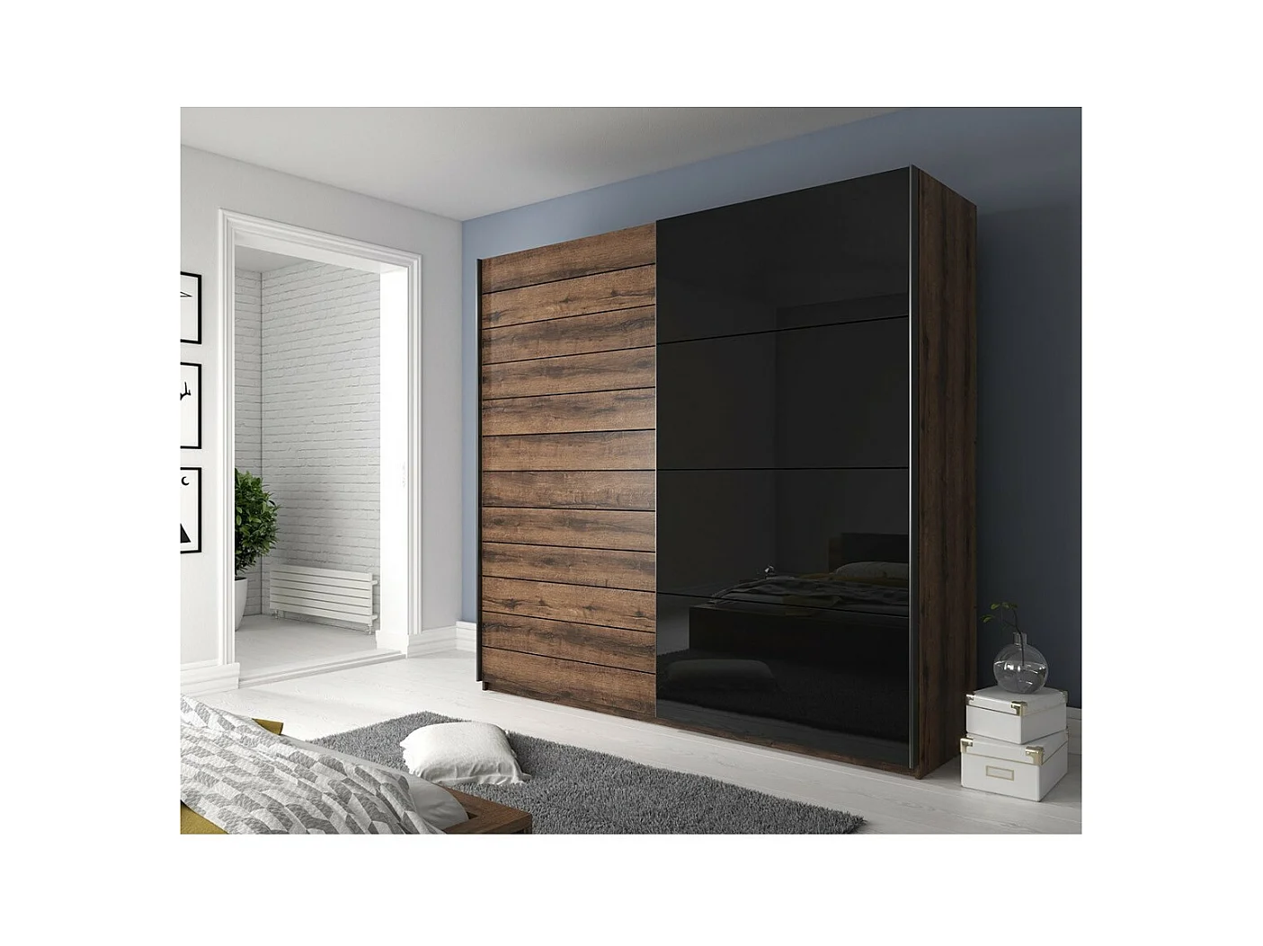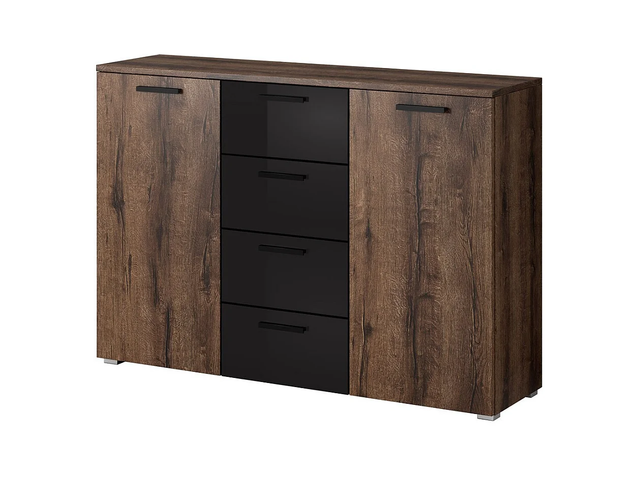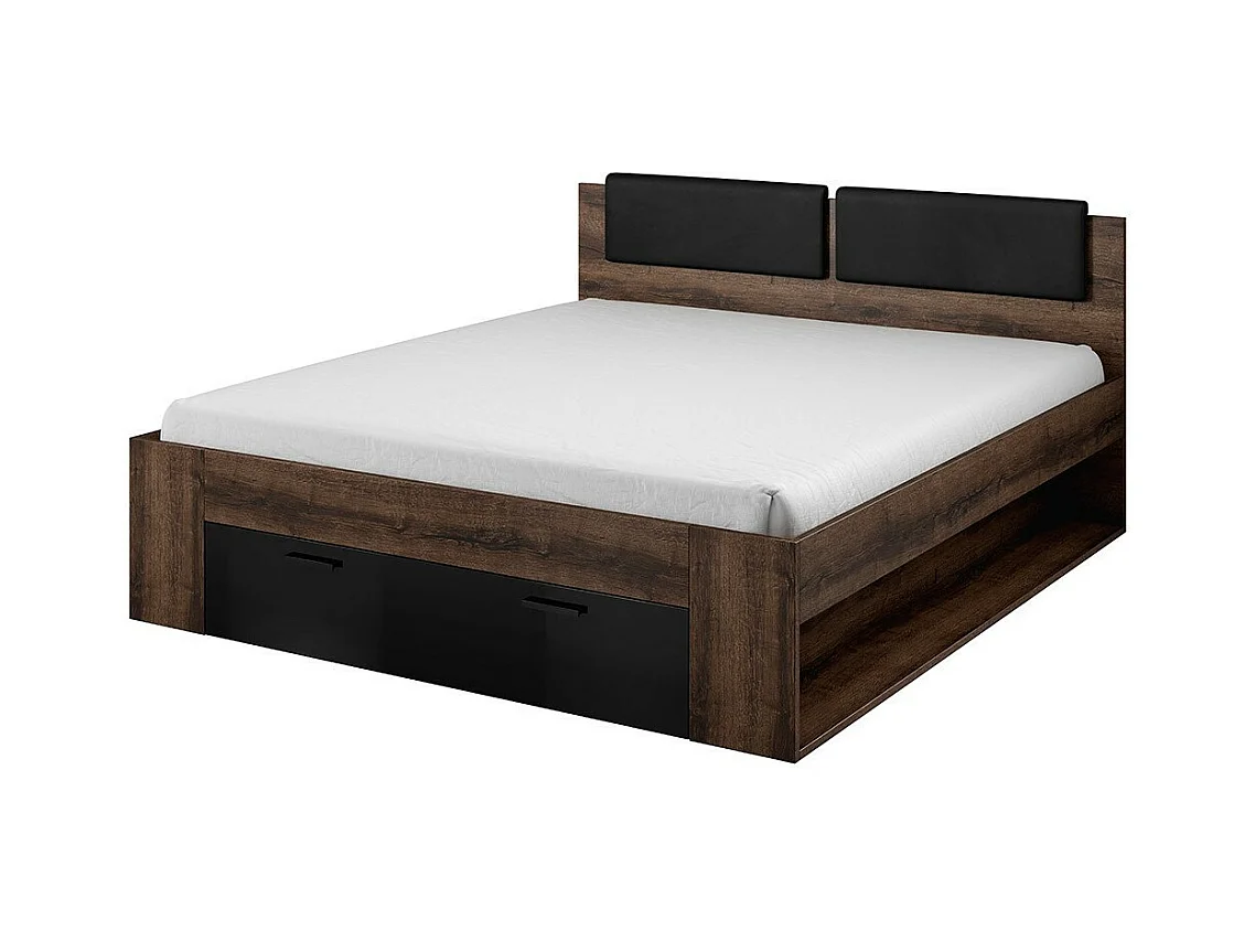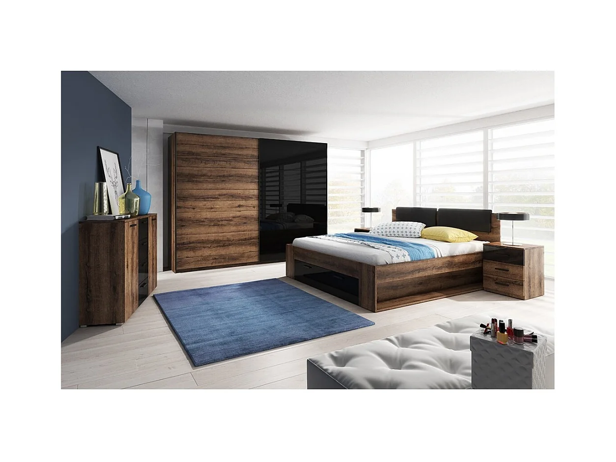 Chambre à coucher FLOYD : Armoire 200cm, Lit 180x200, commode, chevets. Couleur chêne foncé et noir brillant