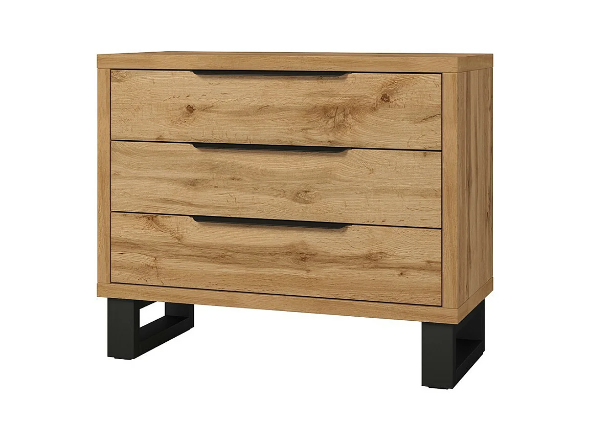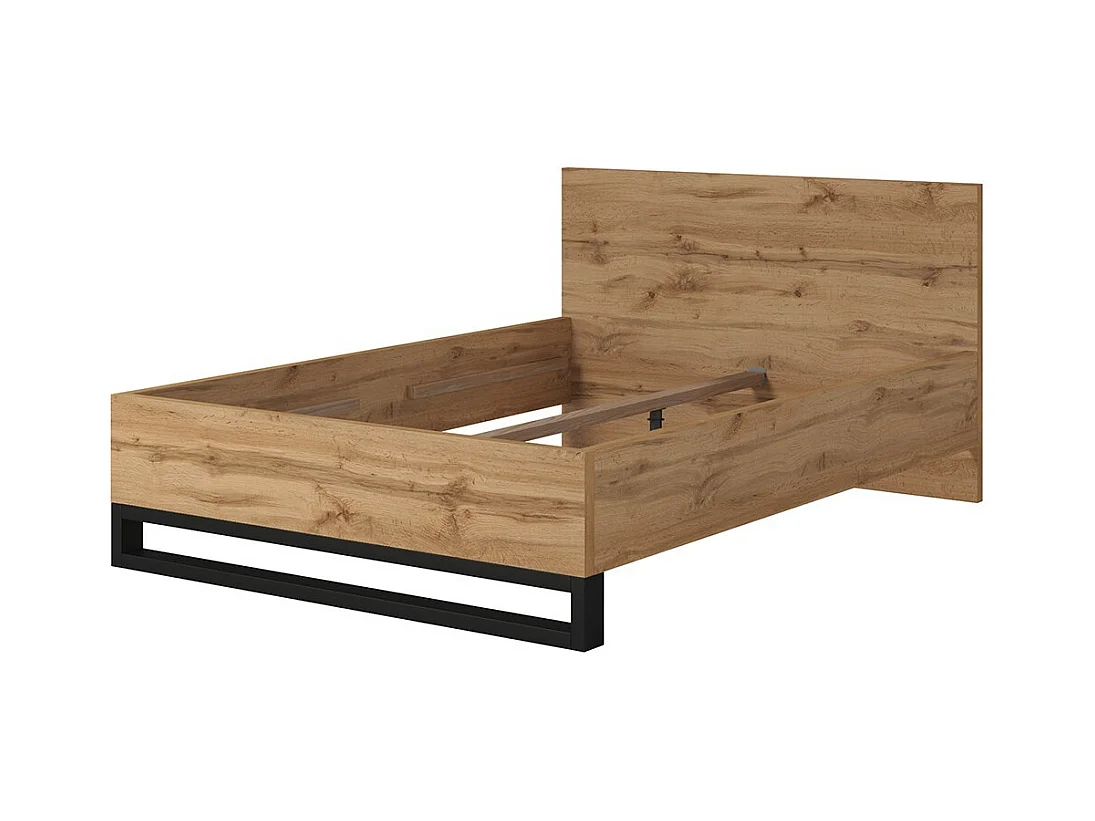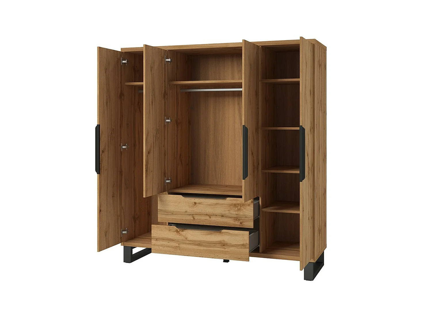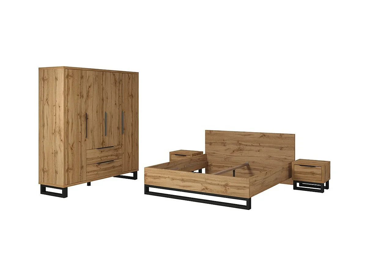 Chambre compléte industrielle MILOS : Armoire 4 portes, lit 160x200, commode, chevets, chêne brut/noir