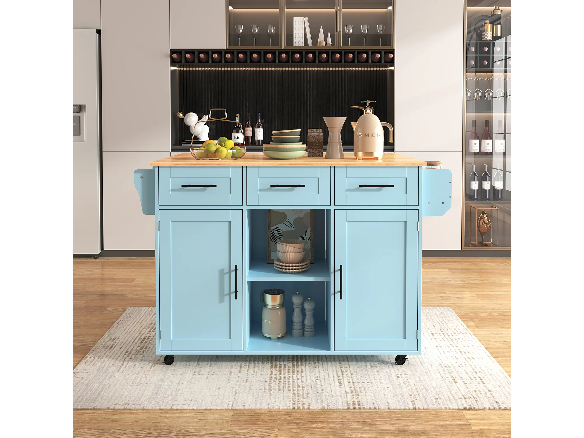 Ilot central de cuisine avec 3 tiroirs et portes de rangement - Plateau extensible - pieds en roulettes ou en bois - Bleu