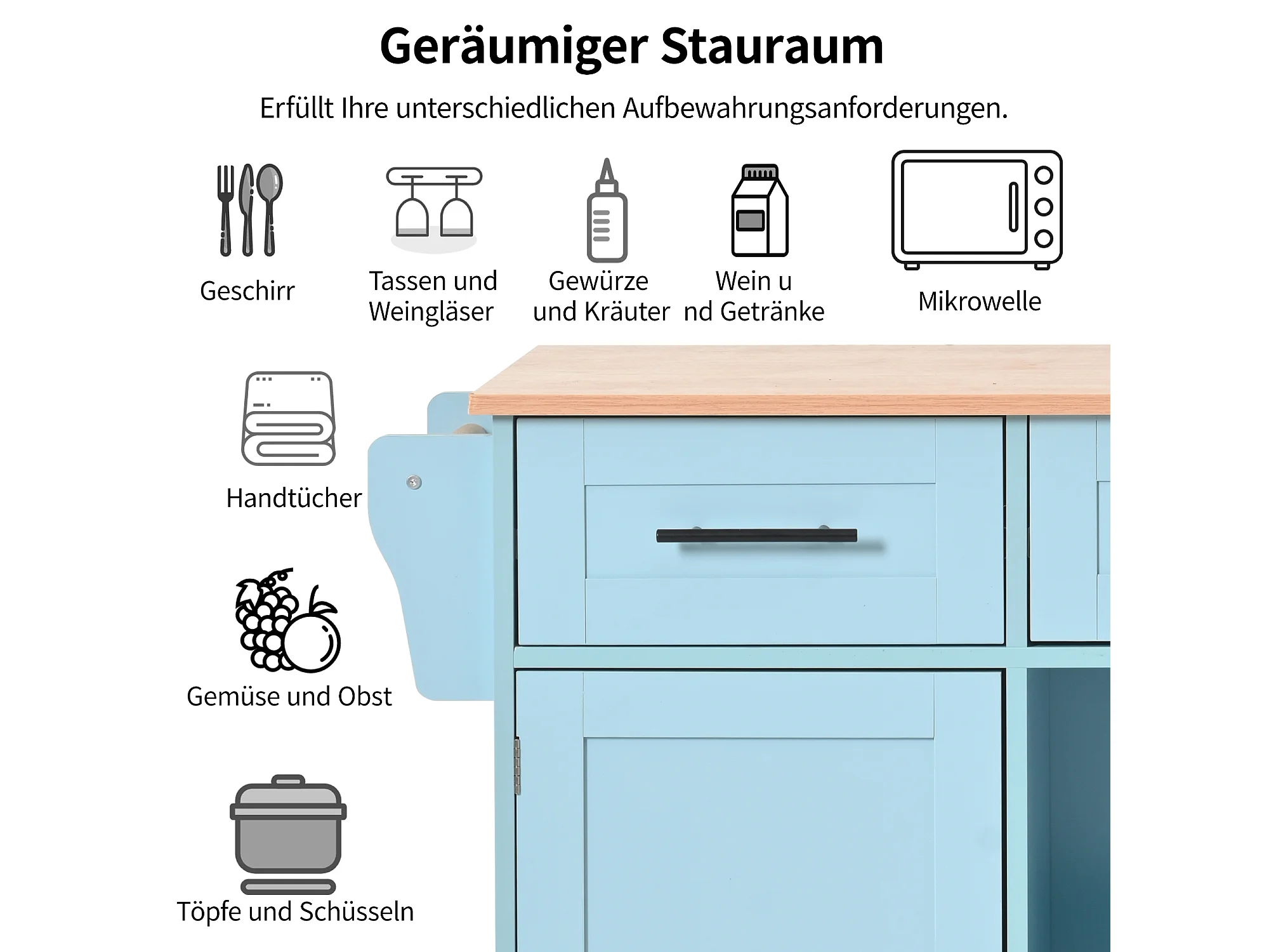 Desserte de cuisine à roulettes avec 3 tiroirs, 2 portes et 2 niches, plateau extensible en placage bois naturel, corps bleu