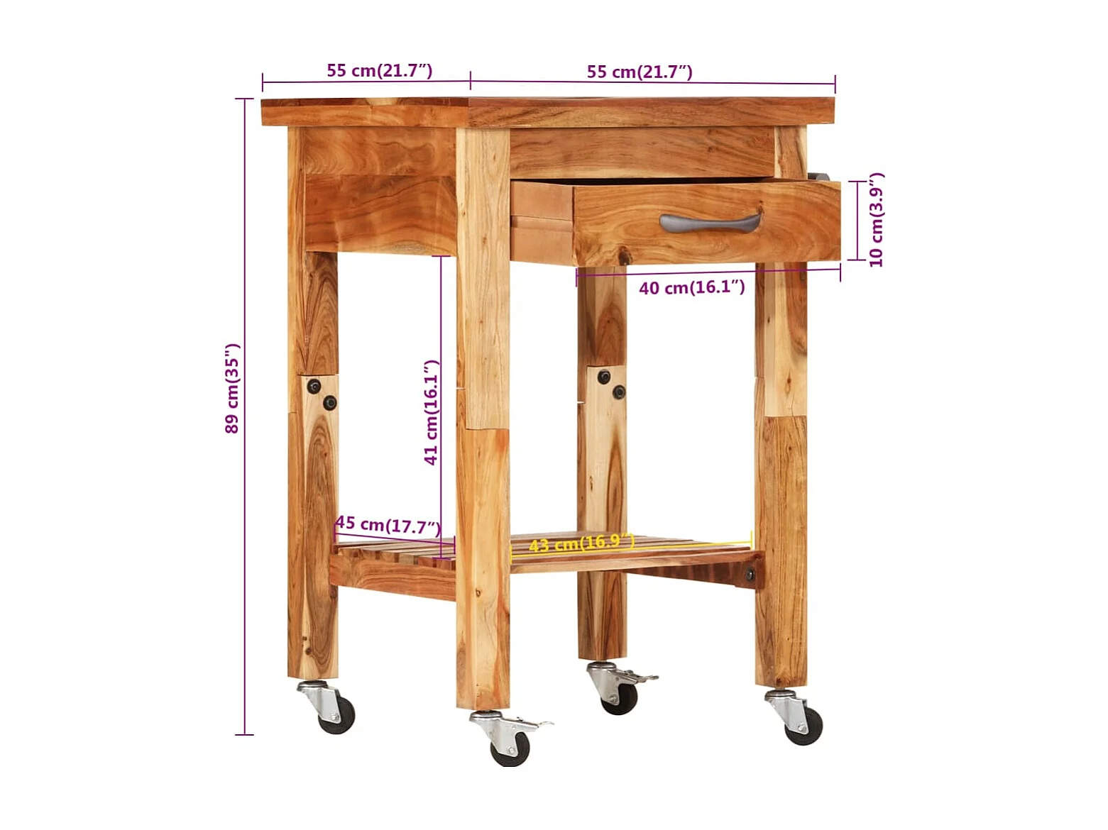 Chariot de cuisine 55x55x89 cm bois massif d'acacia