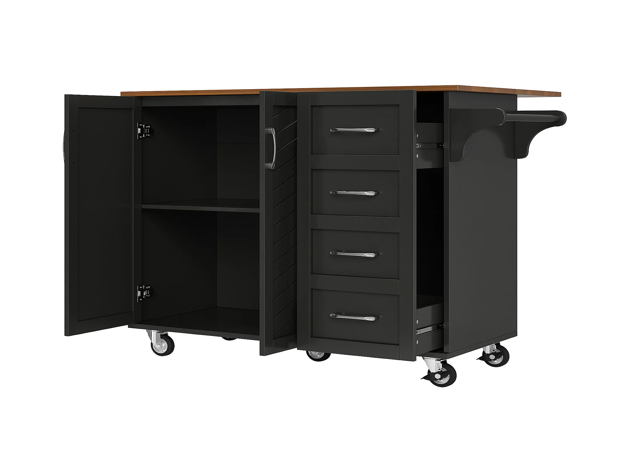 Chariot de cuisine mobile moderne, noir, avec tiroirs et placards, plateau en bois clair (129x46x92 cm)