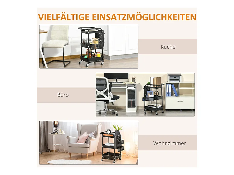 Chariot de cuisine avec panneau perforé, porte-serviettes et paniers de rangement, acier, noir (51.5x32x75.6cm)