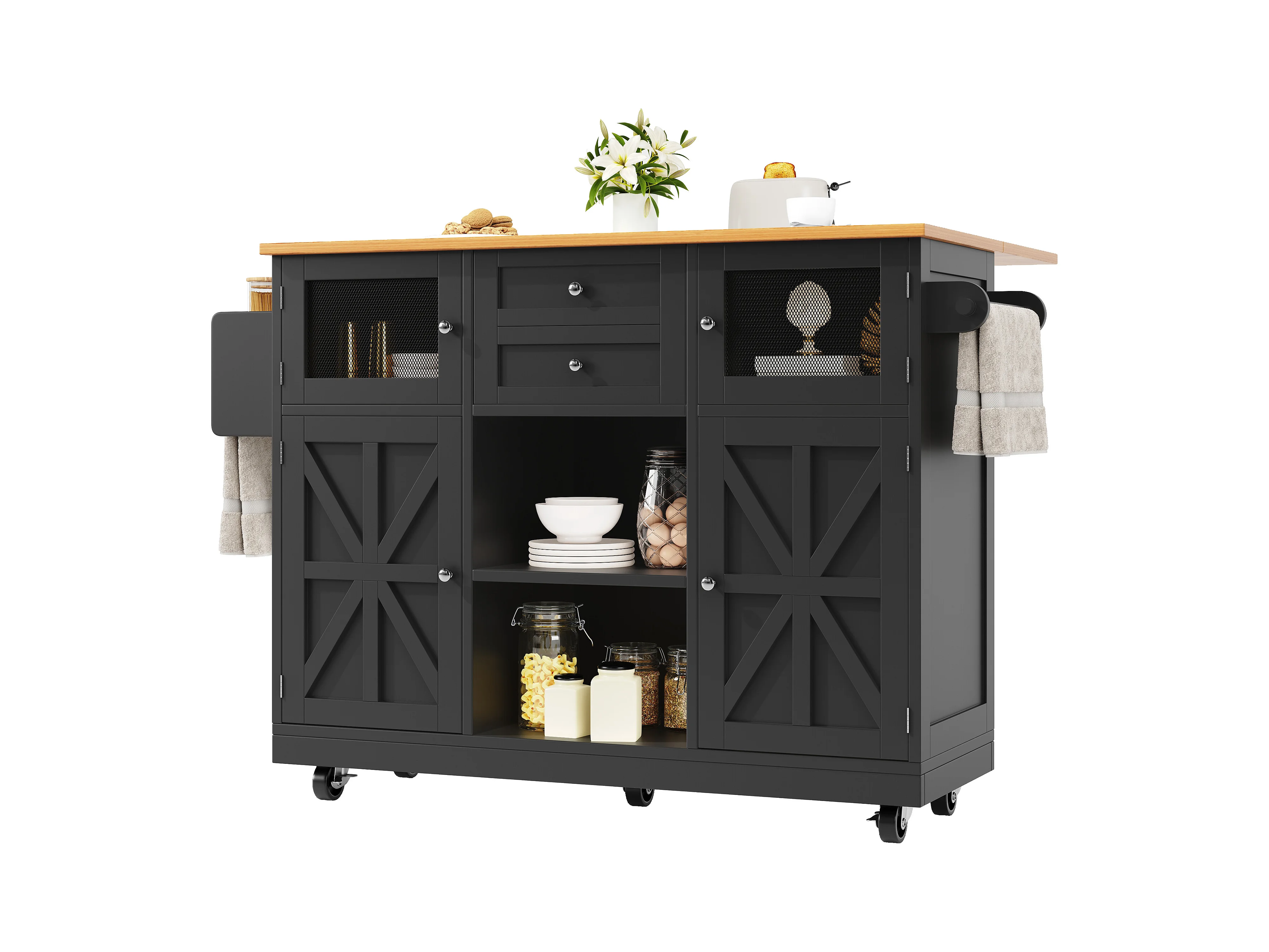 Chariot de Cuisine mobile, moderne et simple, noir, avec étagères et tiroirs, plan de travail en bois clair (129 x 46 x 92 cm)