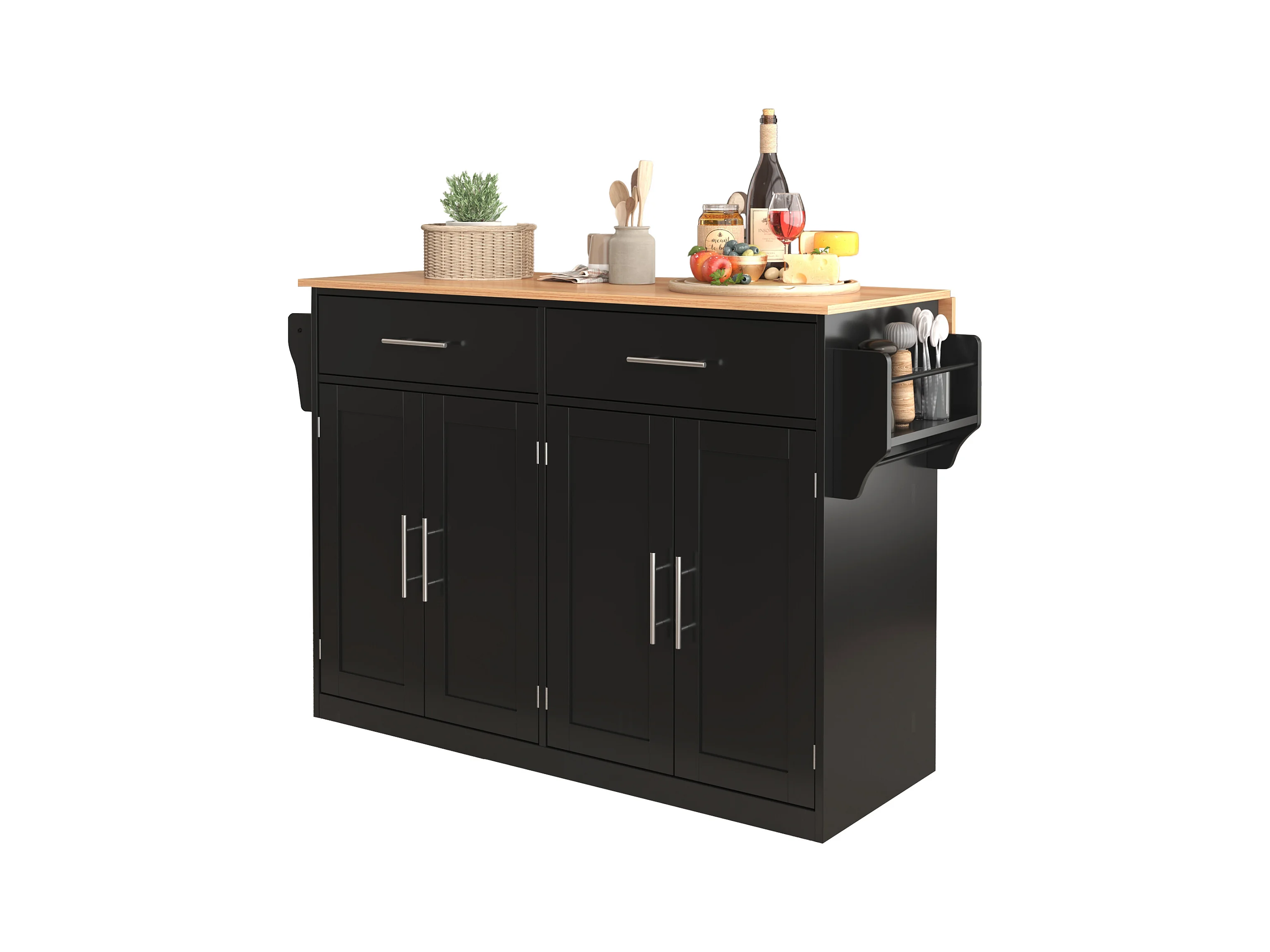 Chariot de cuisine mobile moderne, noir, avec tiroirs et placards, plateau en bois clair (129x46x92 cm)