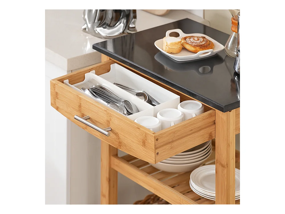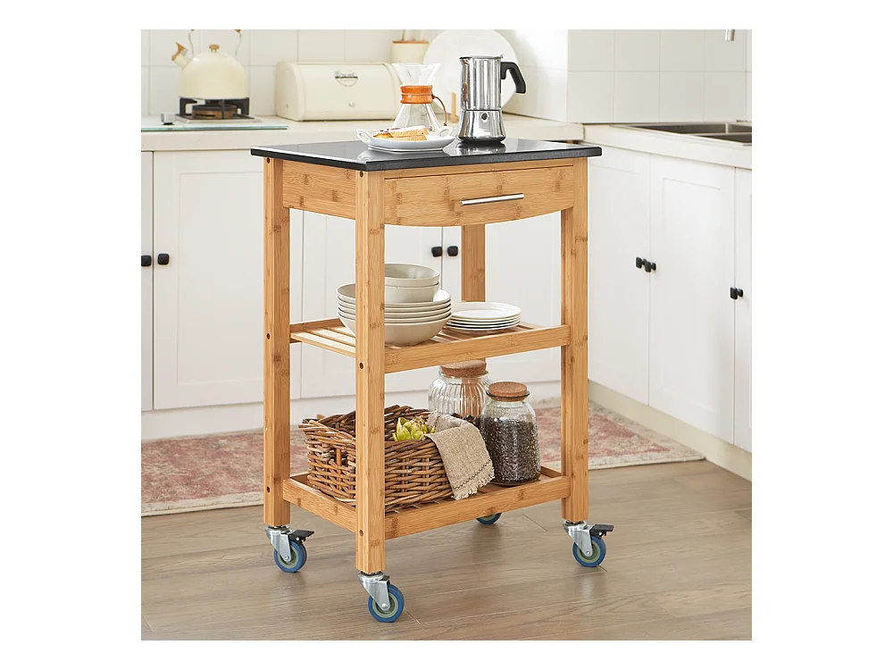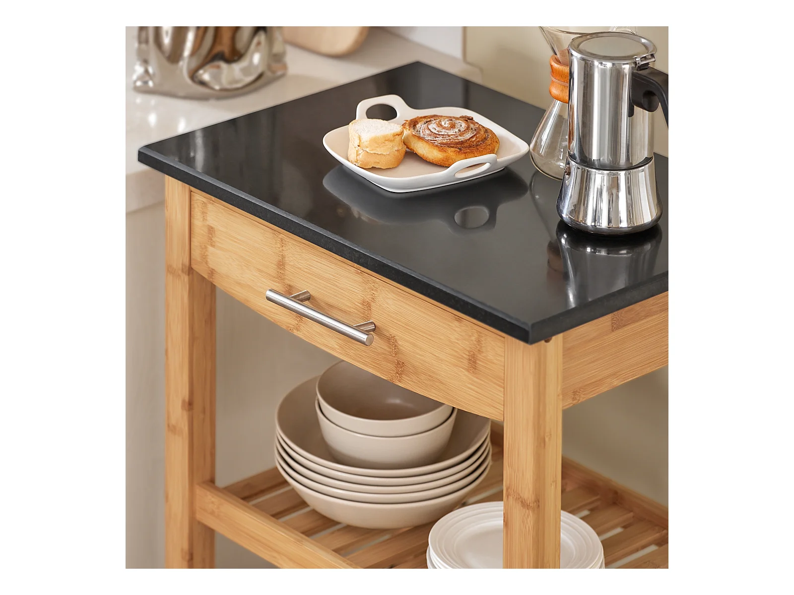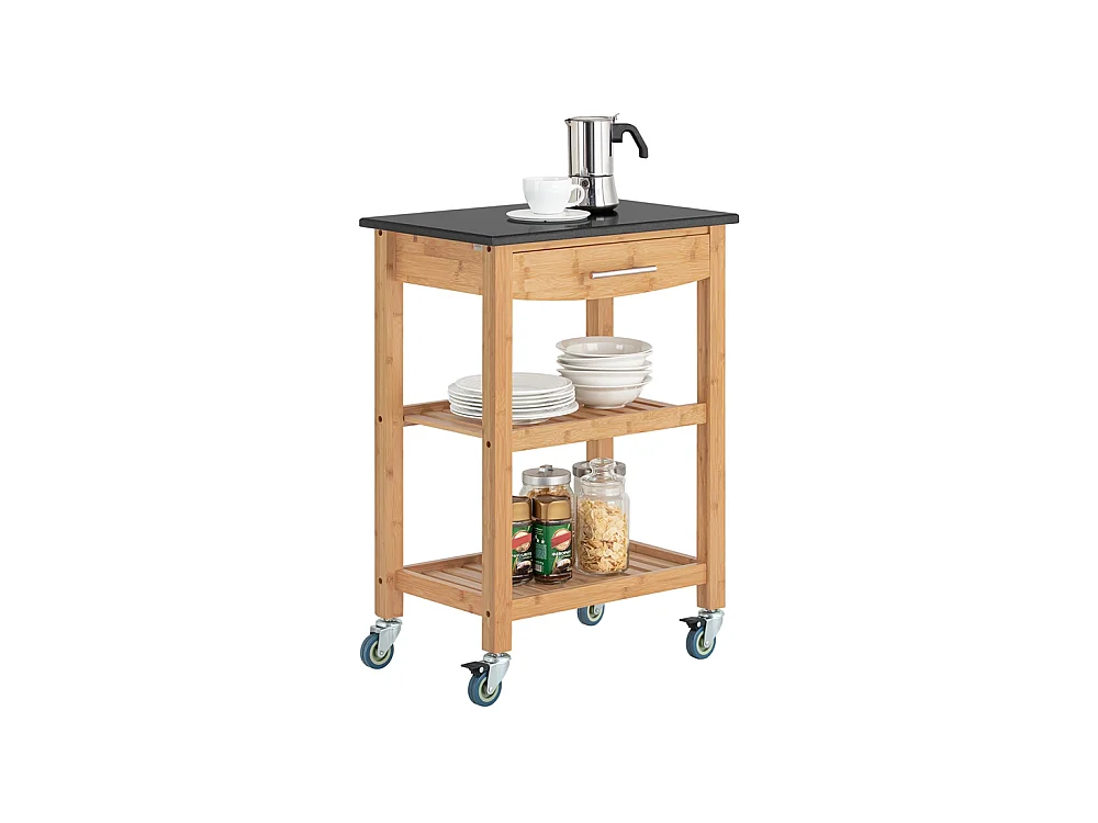 Chariot De Cuisine De Service Roulant En Bambou Plateau En Granit Noir, Fkw28-sch