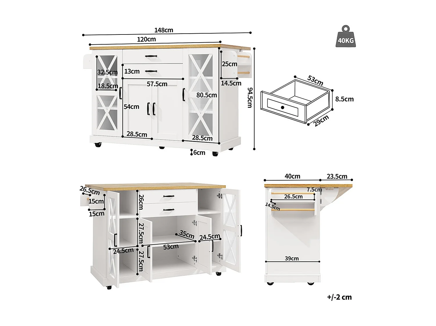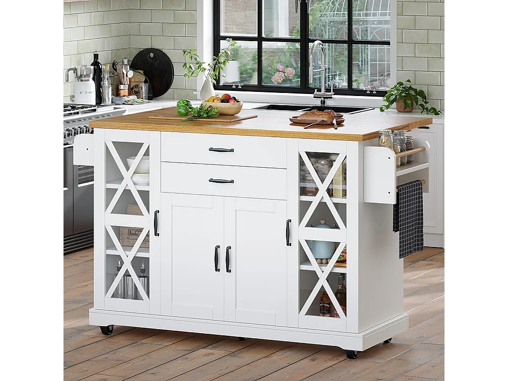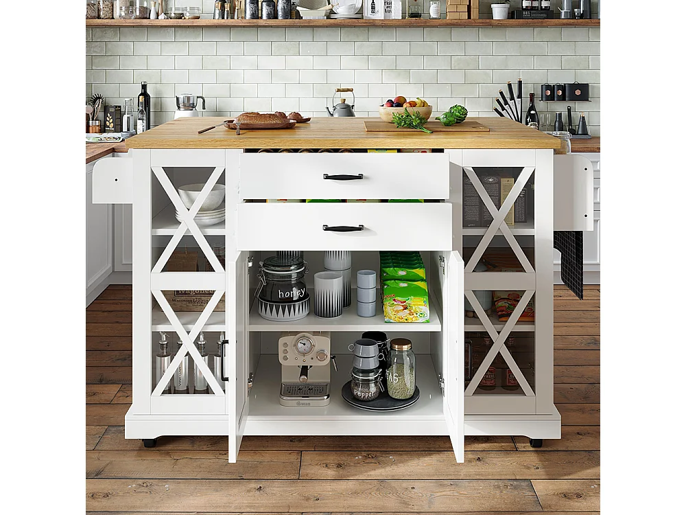 Chariot de cuisine, mobile, sur roulettes, quatre portes (dont deux portes vitrées), étagères réglables, deux tiroirs, blanc