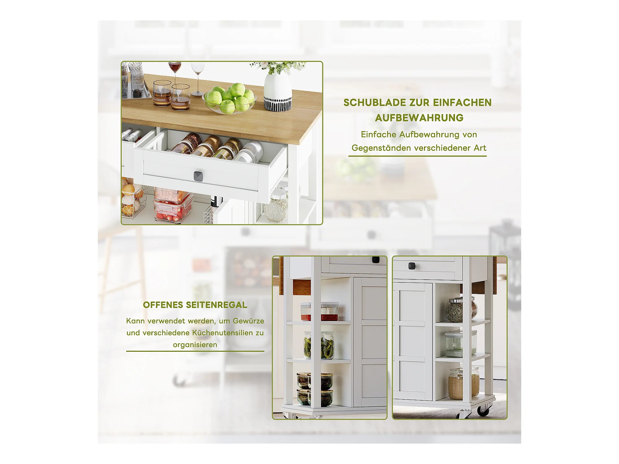 Chariot de cuisine avec plateau rabattable, 3 tiroirs, porte-serviettes, roulettes et pieds en bois interchangeables (112x40(70)x94 cm)