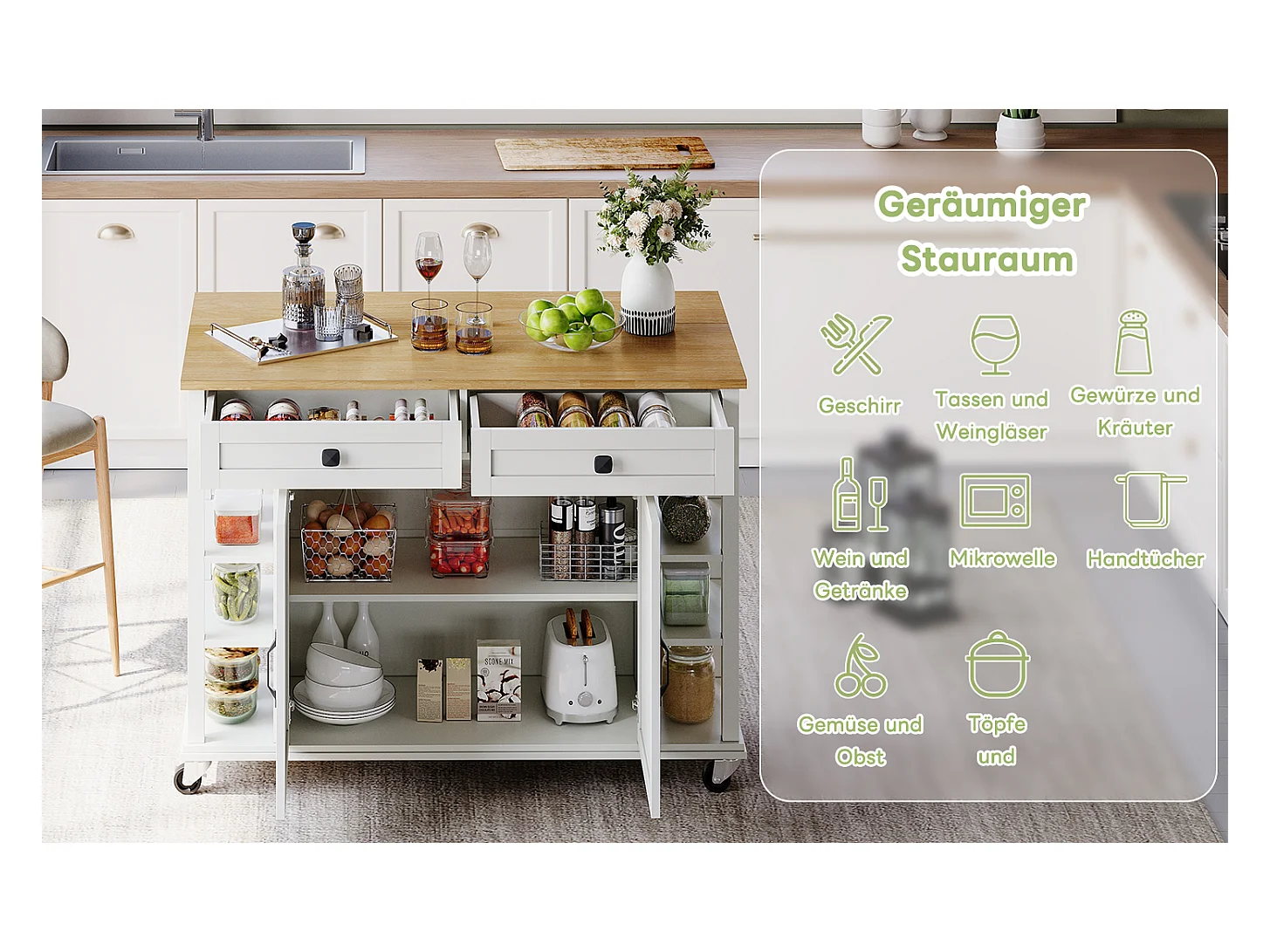 Chariot de cuisine multifonction, plateau rabattable, 2 tiroirs, roulettes, blanc et naturel (L120 x P40 x H89 cm)