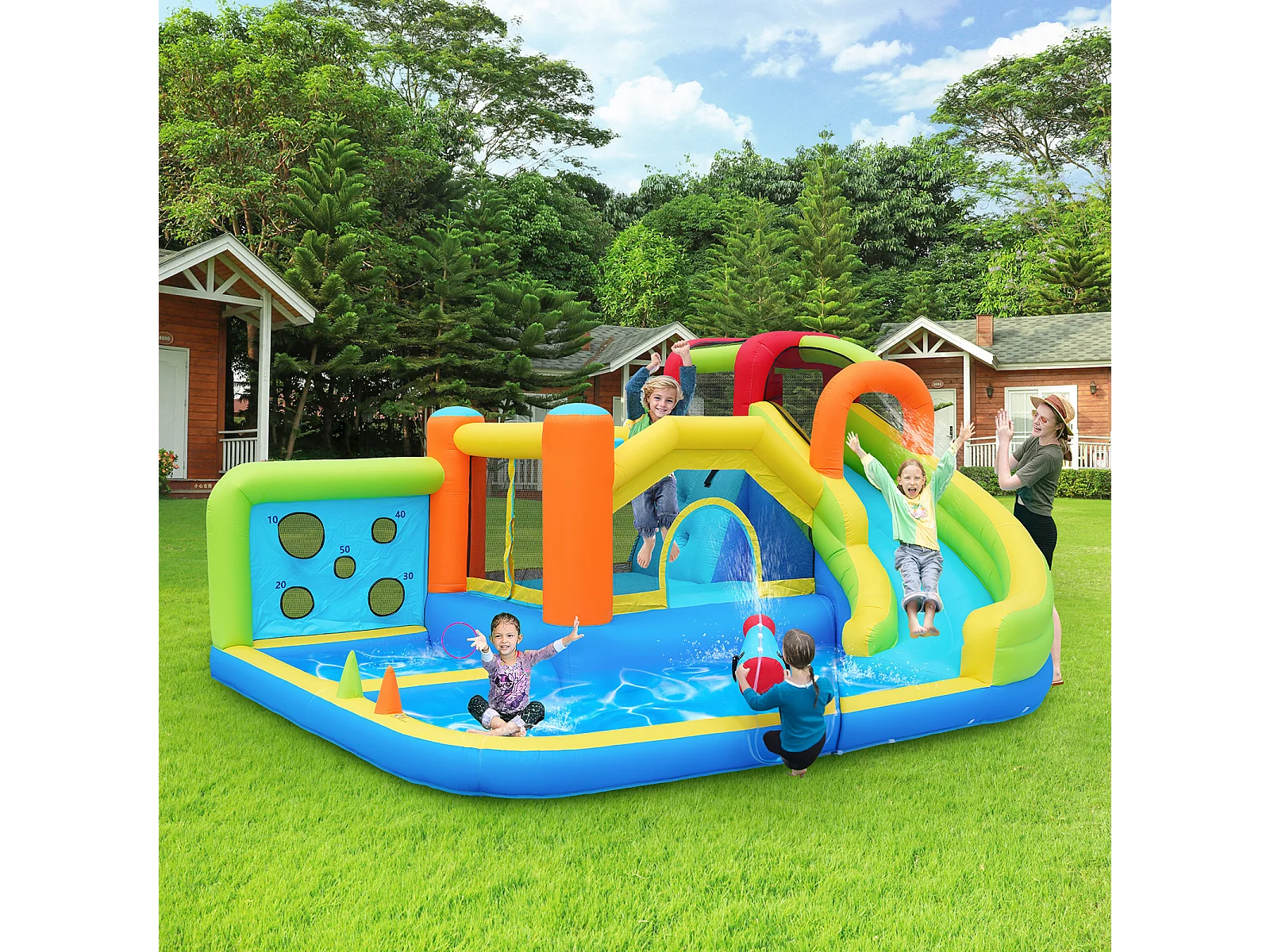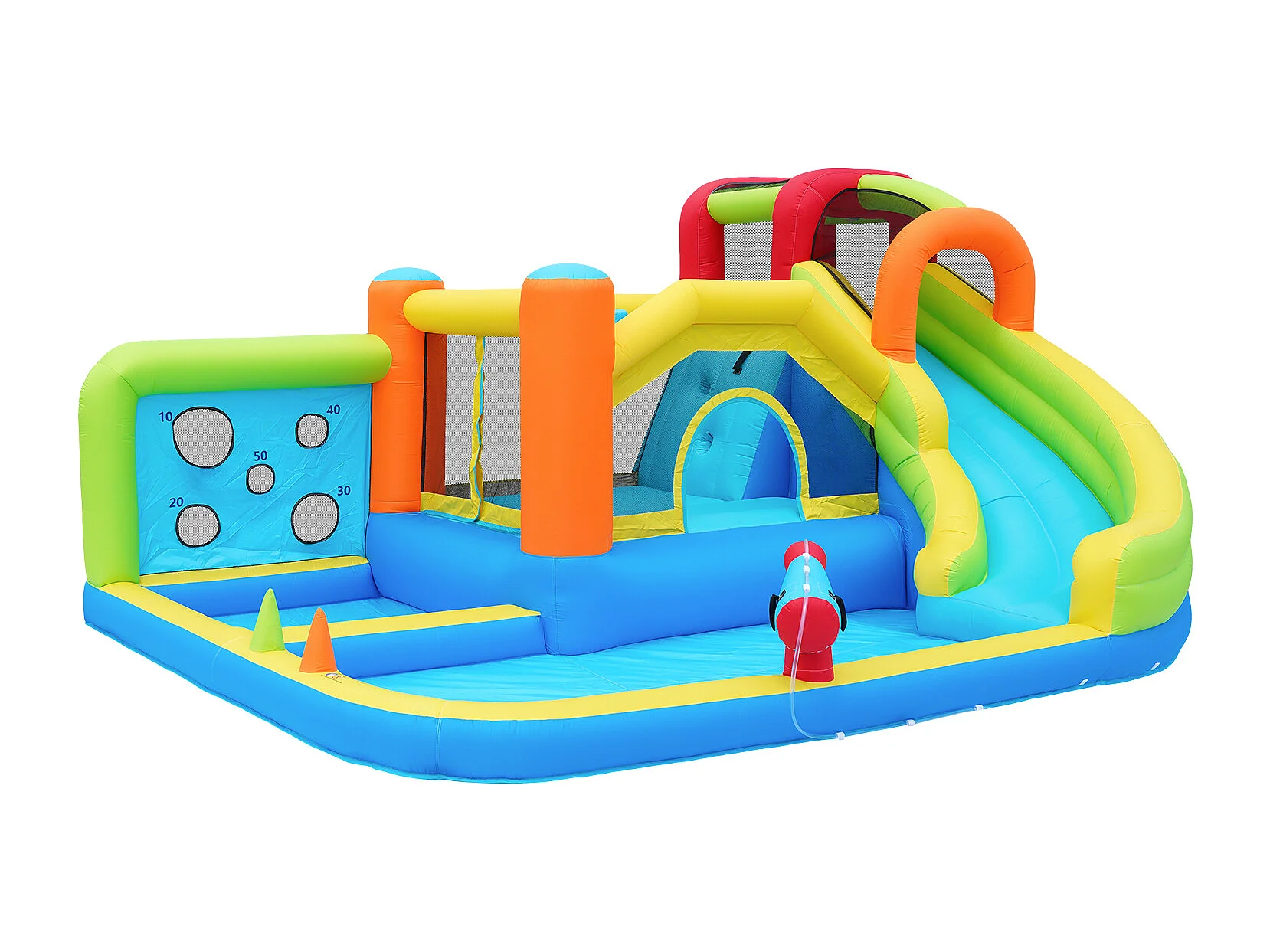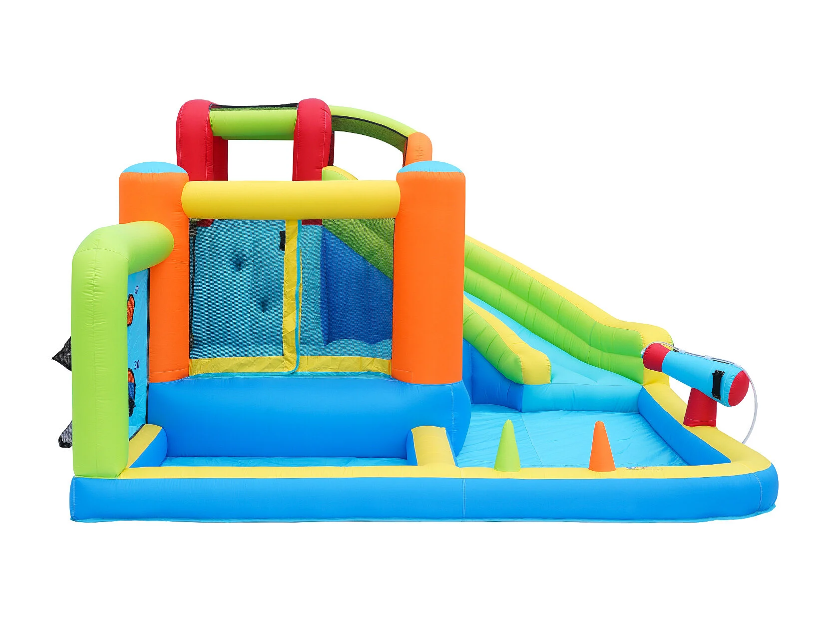 Château gonflable multifonction, usage sec ou humide, toboggan aquatique, mur d'escalade, soufflerie 450 W, tissu Oxford bleu