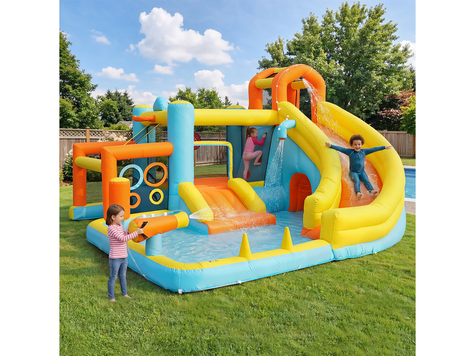 Château gonflable pour enfants 9-en-1 : Aire de Jeux avec Toboggan, Trampoline, Ring de Boxe, Mur d'Escalade et Basket - Souffleur 450W - 405x416x218cm
